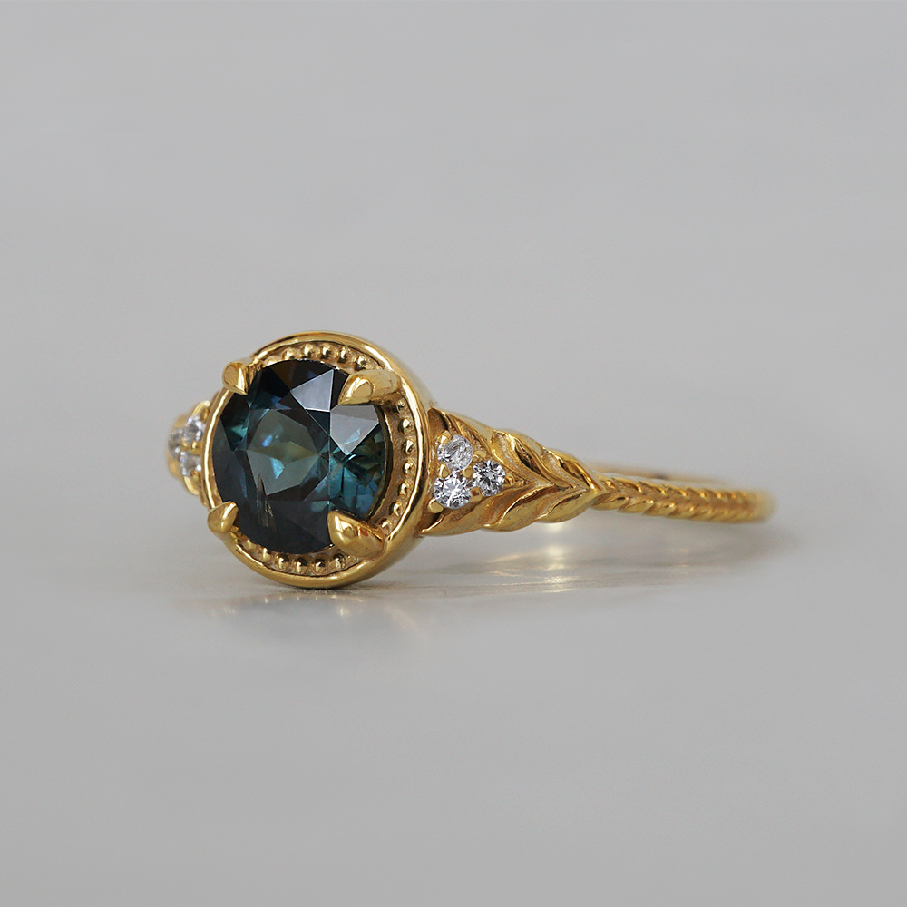 Some things don’t need to be loud to be unforgettable. Marrow is one of those pieces—a quiet, meaningful ring that feels like it’s always been yours. Set with a deep teal sapphire that shifts like forest shadows, the ring is detailed with tiny leaves and vintage-inspired beading. The band has a soft, organic feel, like something found in an old jewelry box tucked away with love letters. A few natural white diamonds add just the right sparkle, like dew catching morning light. Handcrafted in your choice of 14K and 18K Gold.