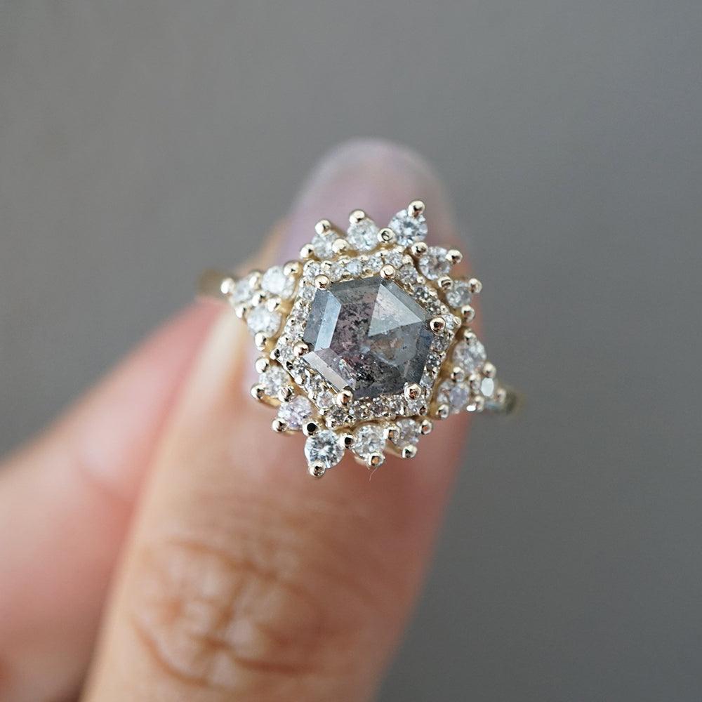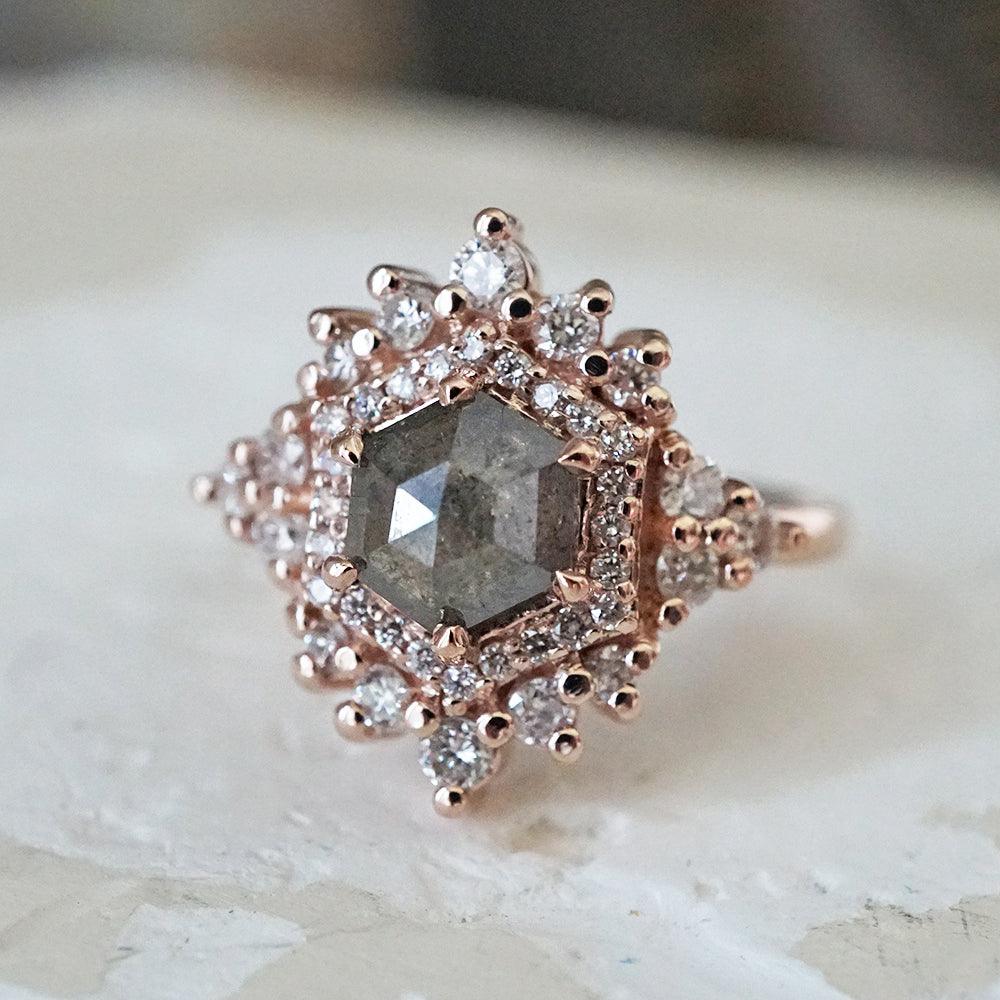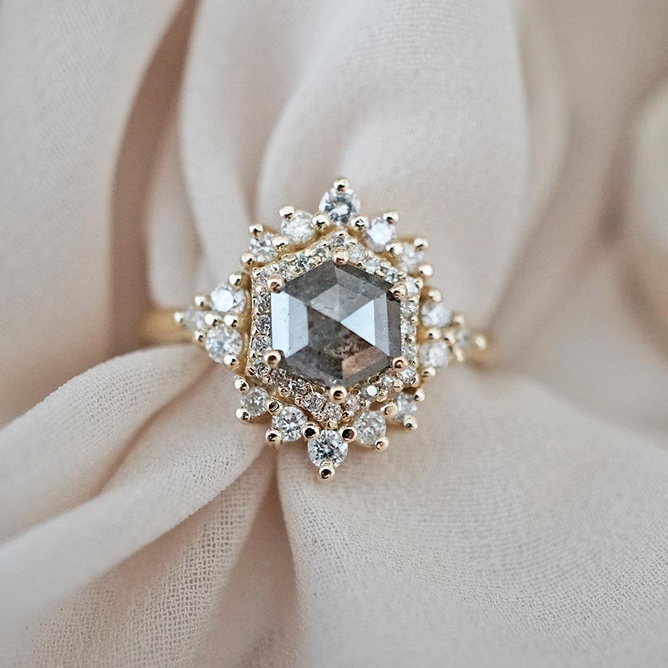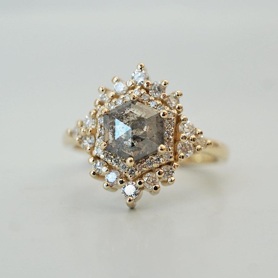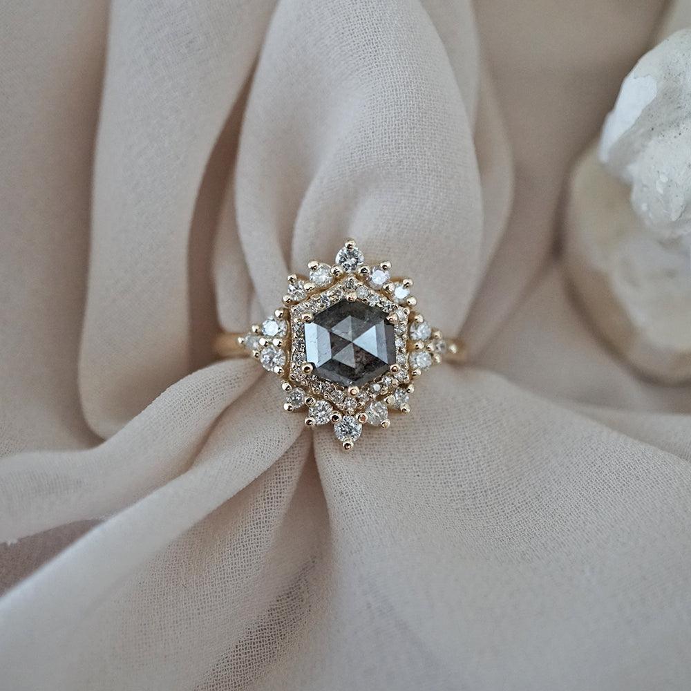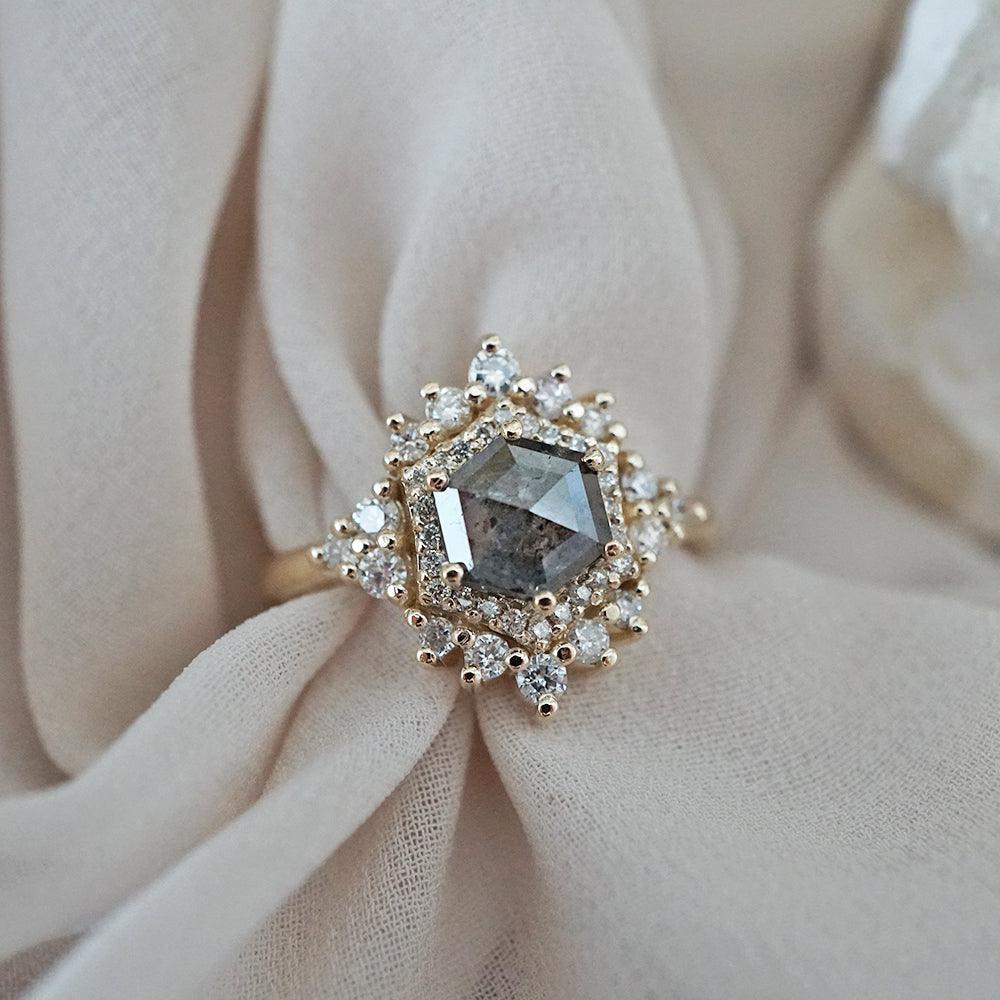 Inspired by the Palace of Versailles, our Palace Ring reflects its delicate beauty. A hexagon salt & pepper diamond, surrounded by white diamonds, captures the essence of Versailles' details. Each salt & pepper diamond is unique, making this ring truly one-of-a-kind. Crafted in 14K and 18K yellow, rose, or white gold, it's your royal touch.