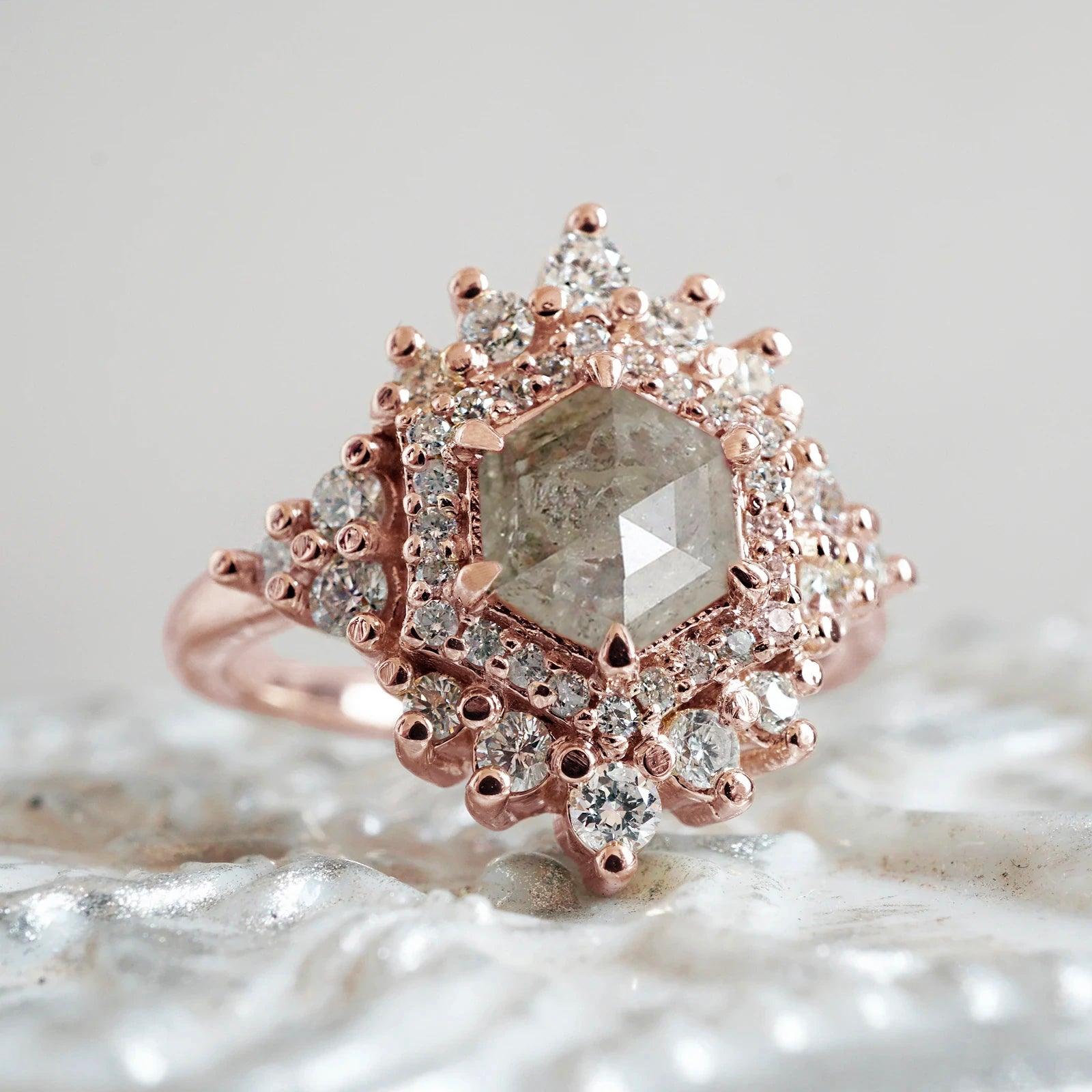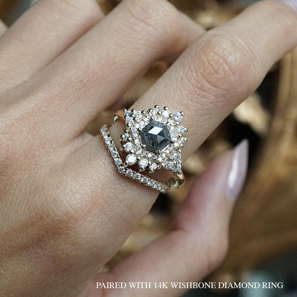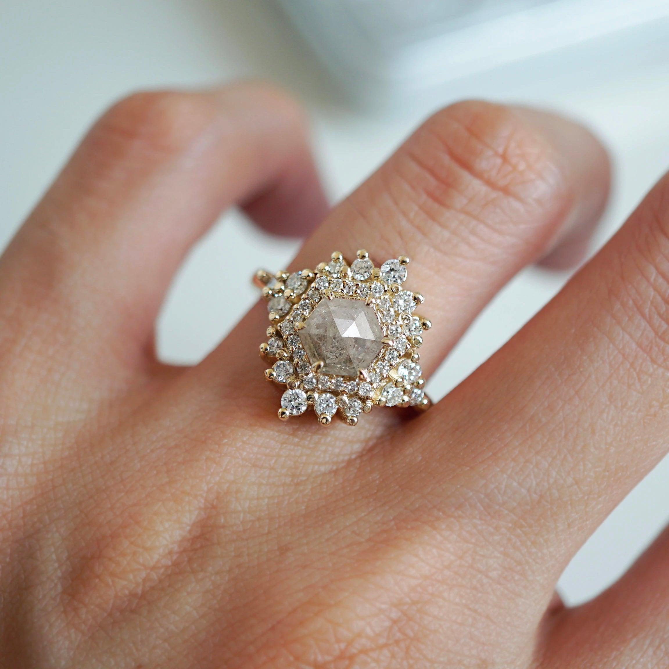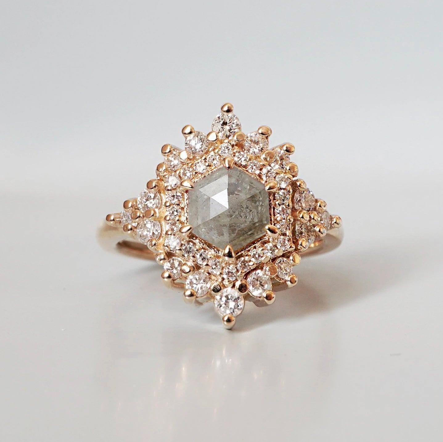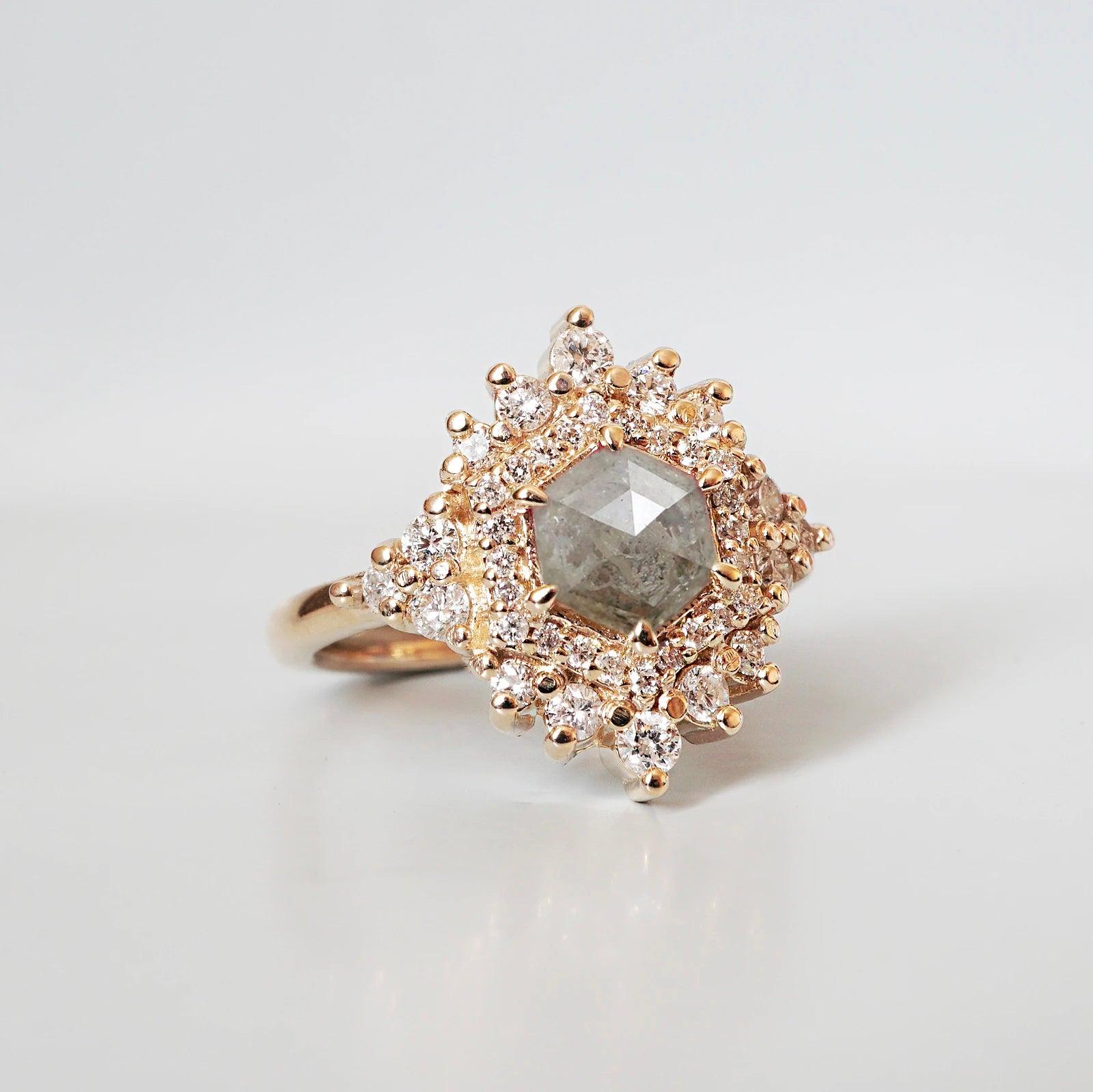 Inspired by the Palace of Versailles, our Palace Ring reflects its delicate beauty. A hexagon salt & pepper diamond, surrounded by white diamonds, captures the essence of Versailles' details. Each salt & pepper diamond is unique, making this ring truly one-of-a-kind. Crafted in 14K and 18K yellow, rose, or white gold, it's your royal touch.