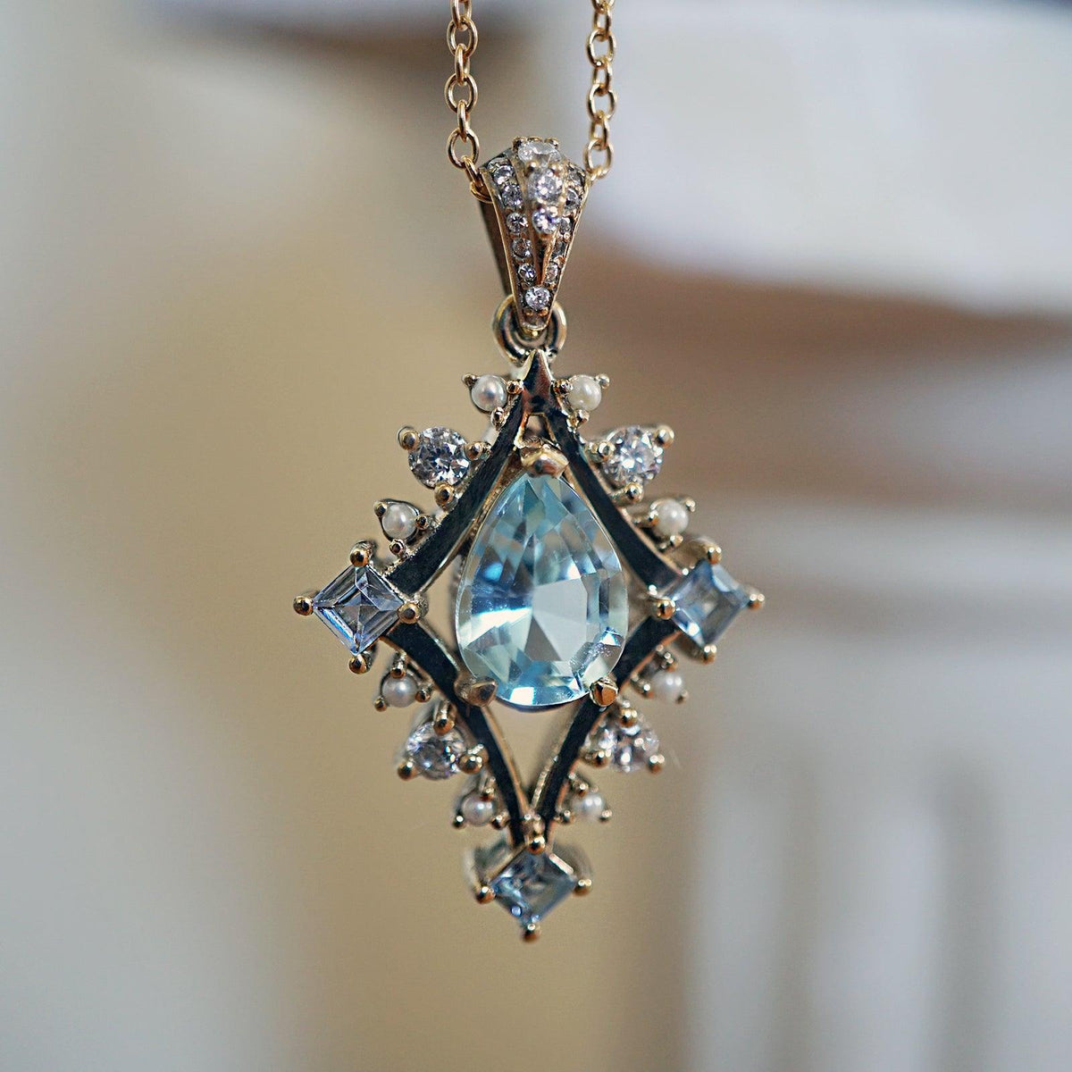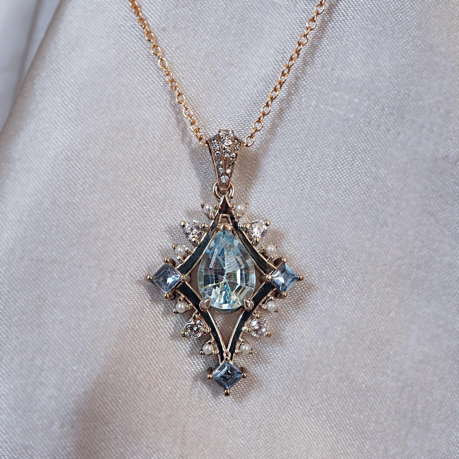 At its heart glows a 1.75ct natural pear shaped aquamarine, serene and luminous as calm ocean light. Framed by natural white diamonds and freshwater pearls, each detail glimmers like sunlight dancing upon gentle waves. Handcrafted in rich 14K solid gold, it’s a treasure meant to be cherished for a lifetime.