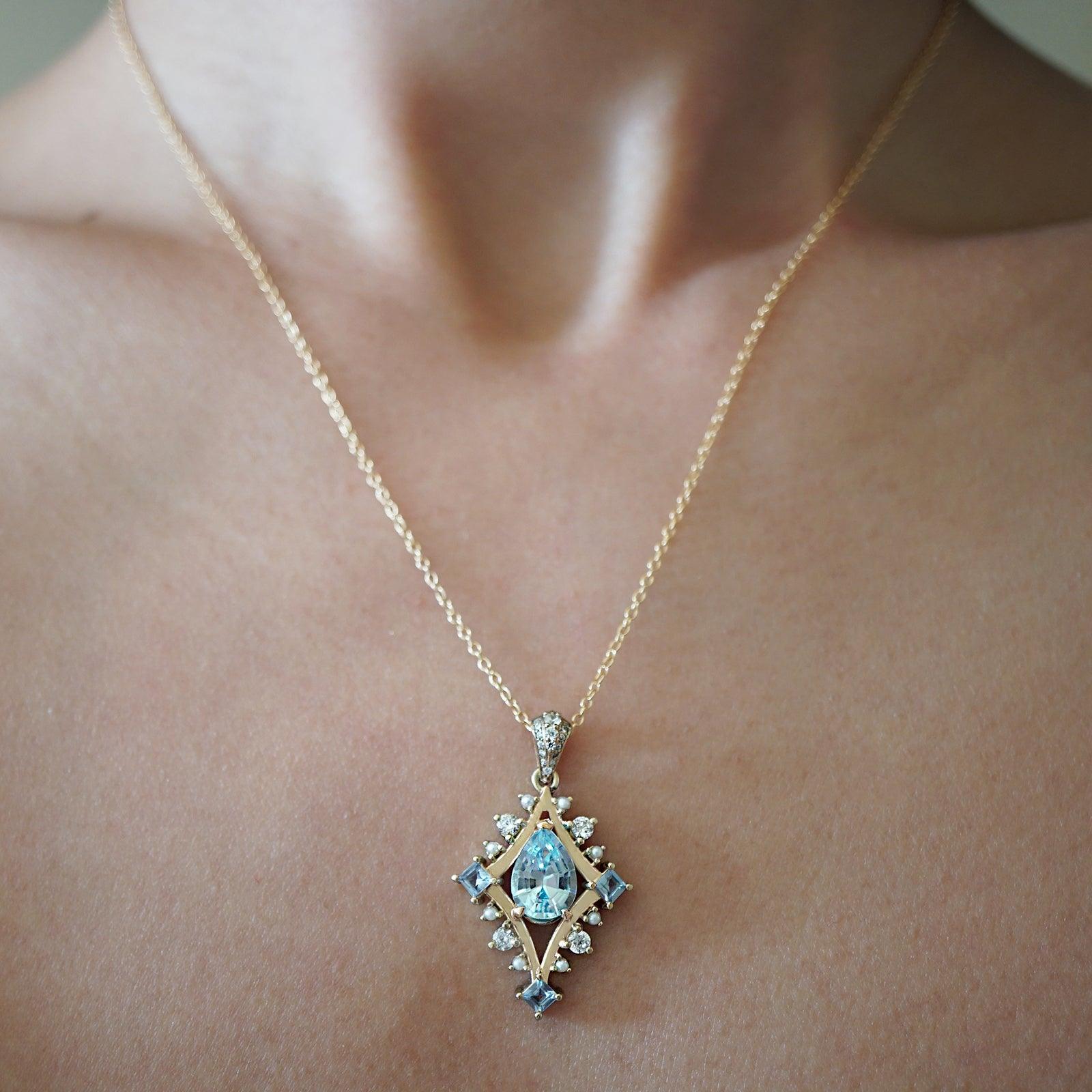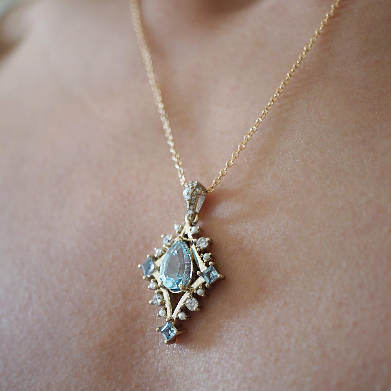 With diamond accents along the bail, princess-cut aquamarines, and delicate pearls, The Sea & Sky Necklace is a poetic ode to the women who carry both grace and strength — as vast and beautiful as the sea itself.
