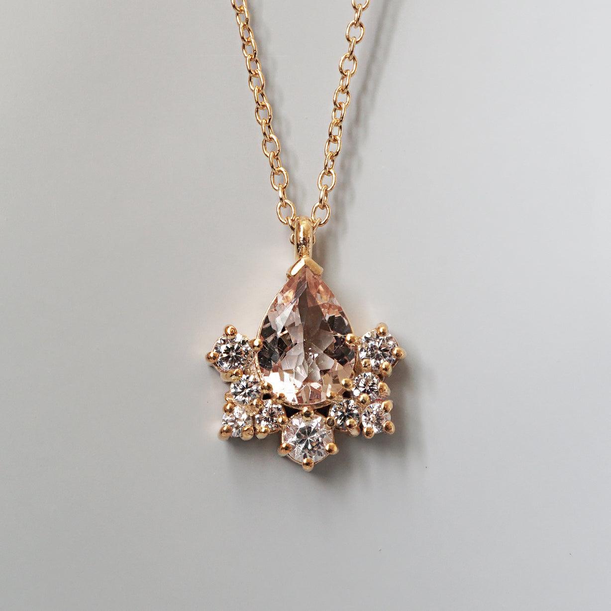 The Morganite Crown Necklace radiates soft elegance and timeless romance. A peachy pear-cut morganite glows at its center, encircled by a delicate crown of sparkling stones that catch the light with every movement.