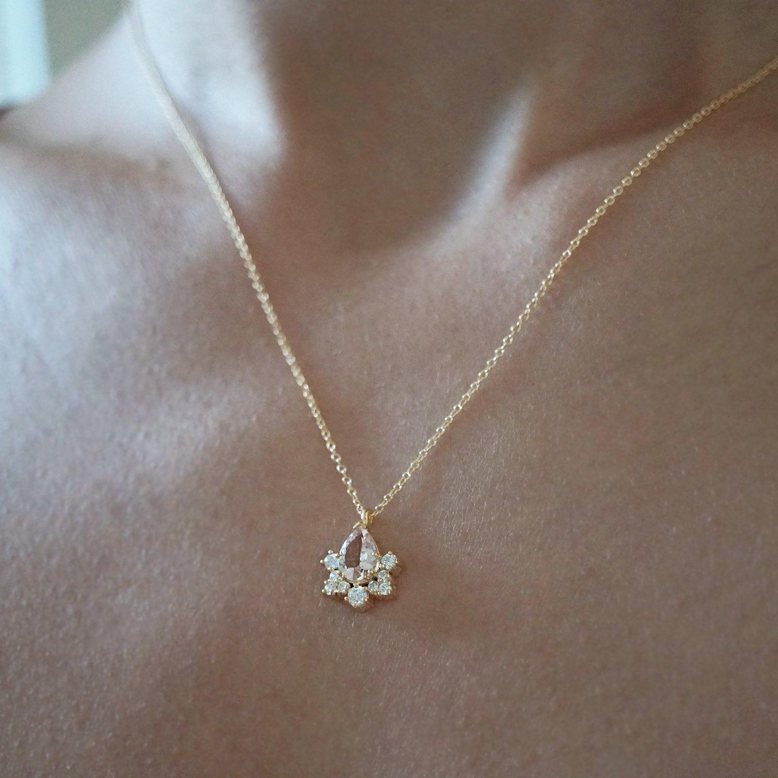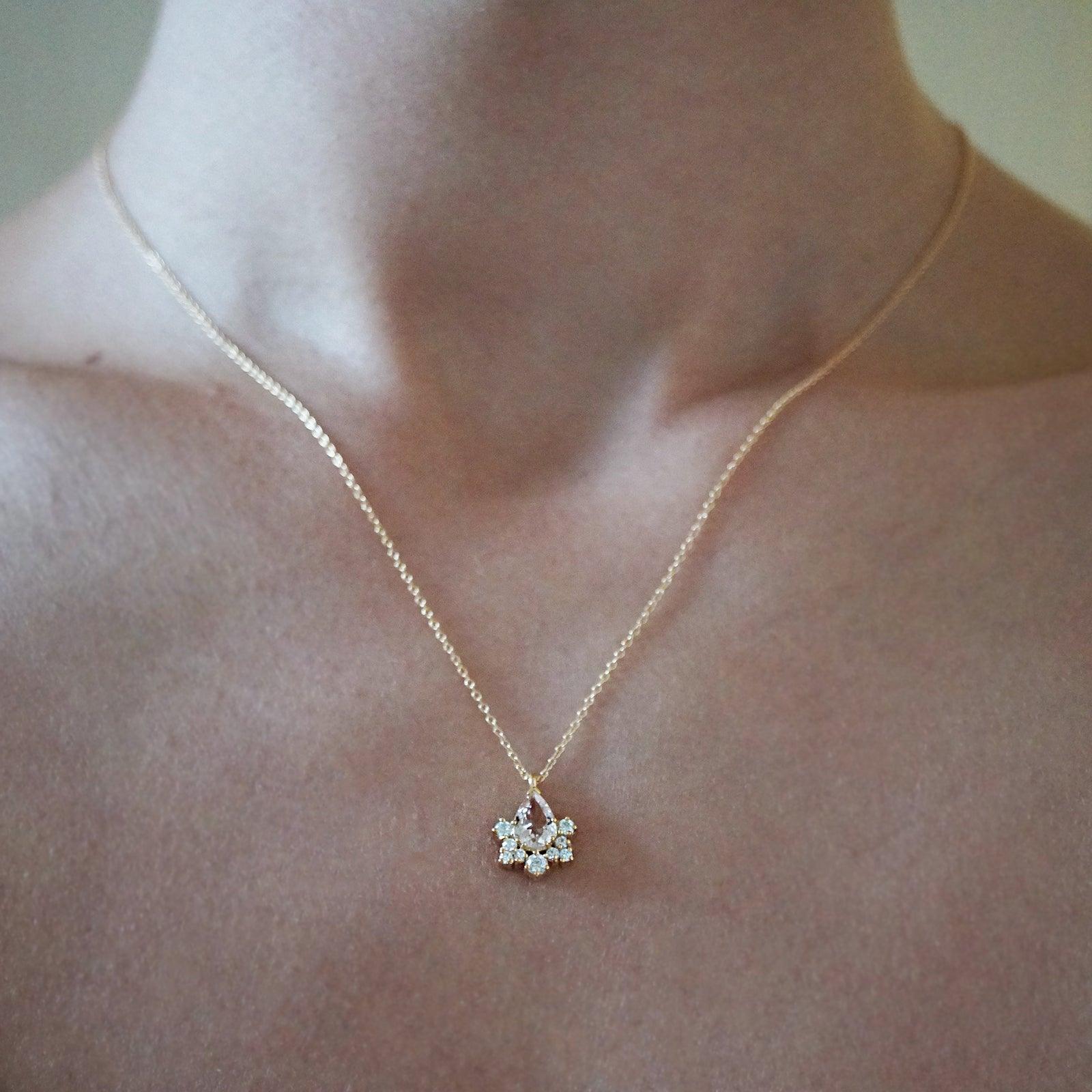 Suspended on a gold-filled chain, this necklace is handcrafted for the modern romantic — graceful, luminous, and effortlessly regal. Available in sterling silver or 14K solid gold, it’s a piece that adds a touch of gentle sophistication to any look.