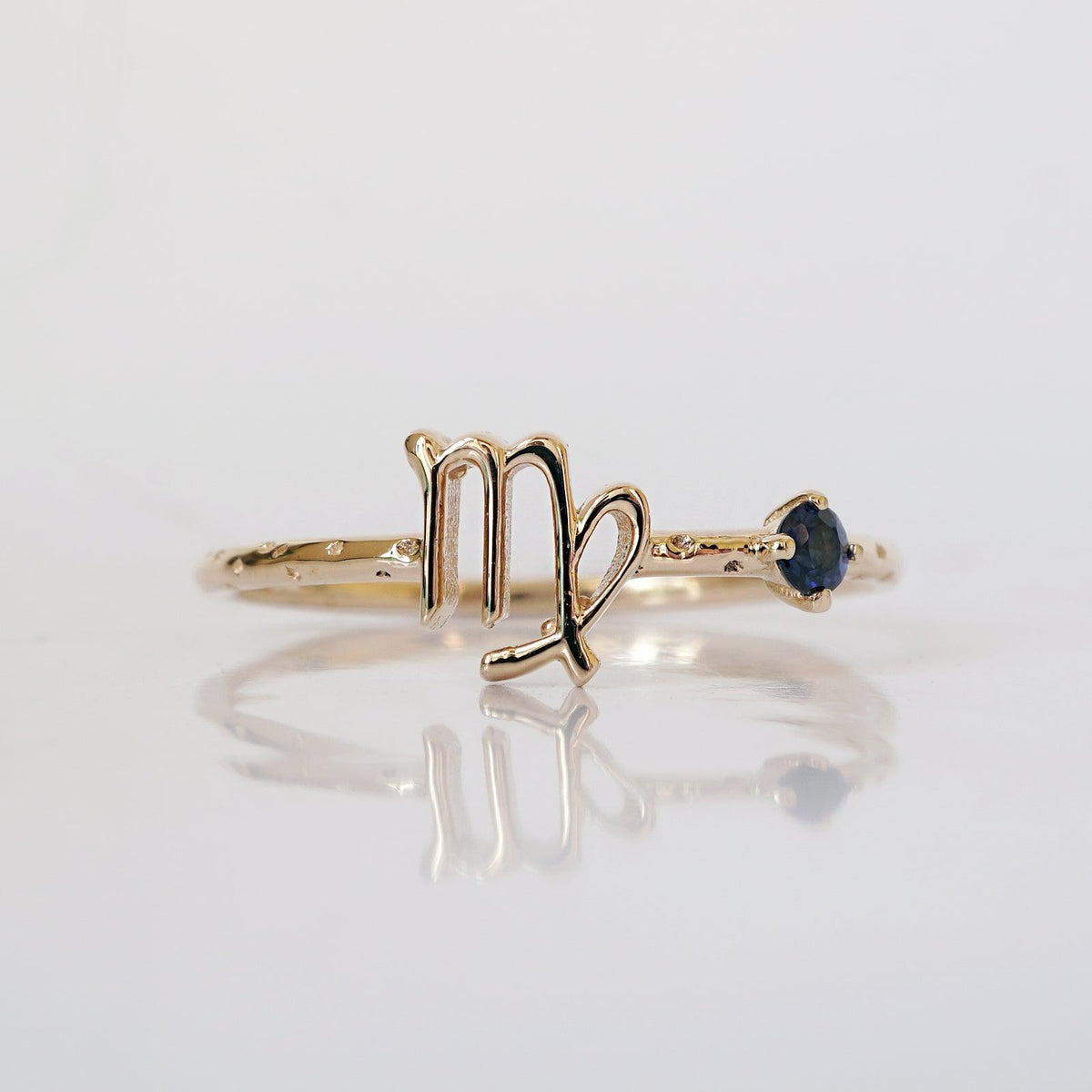 The Virgo Zodiac Ring reflects purity, wisdom, and quiet strength — qualities that define this earth sign. A luminous blue sapphire, Virgo’s birthstone, rests upon a star-engraved band that captures the poetry of the night sky.