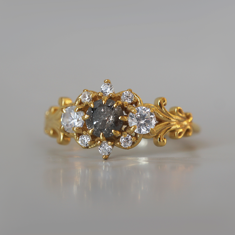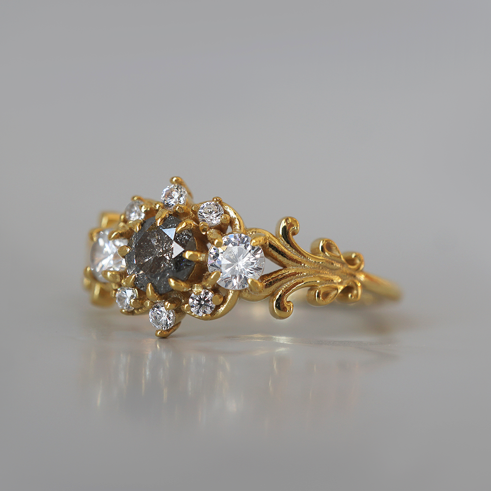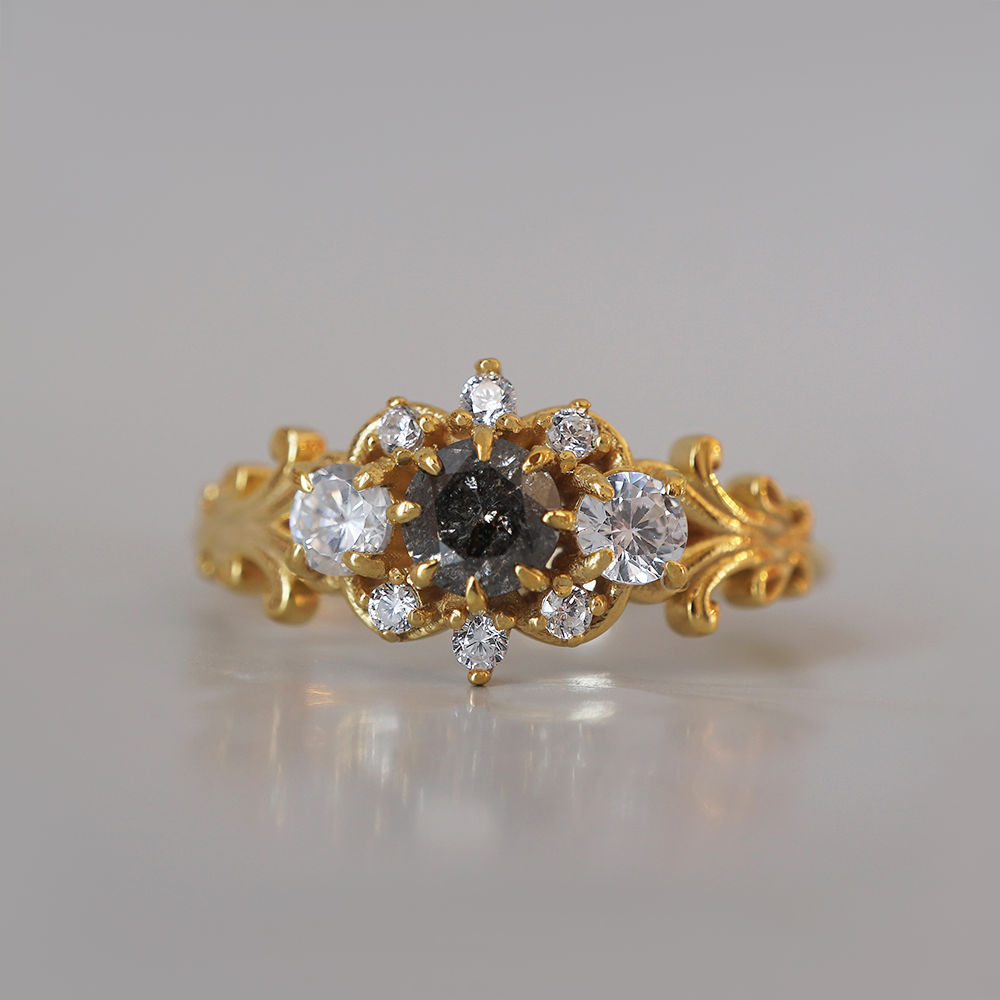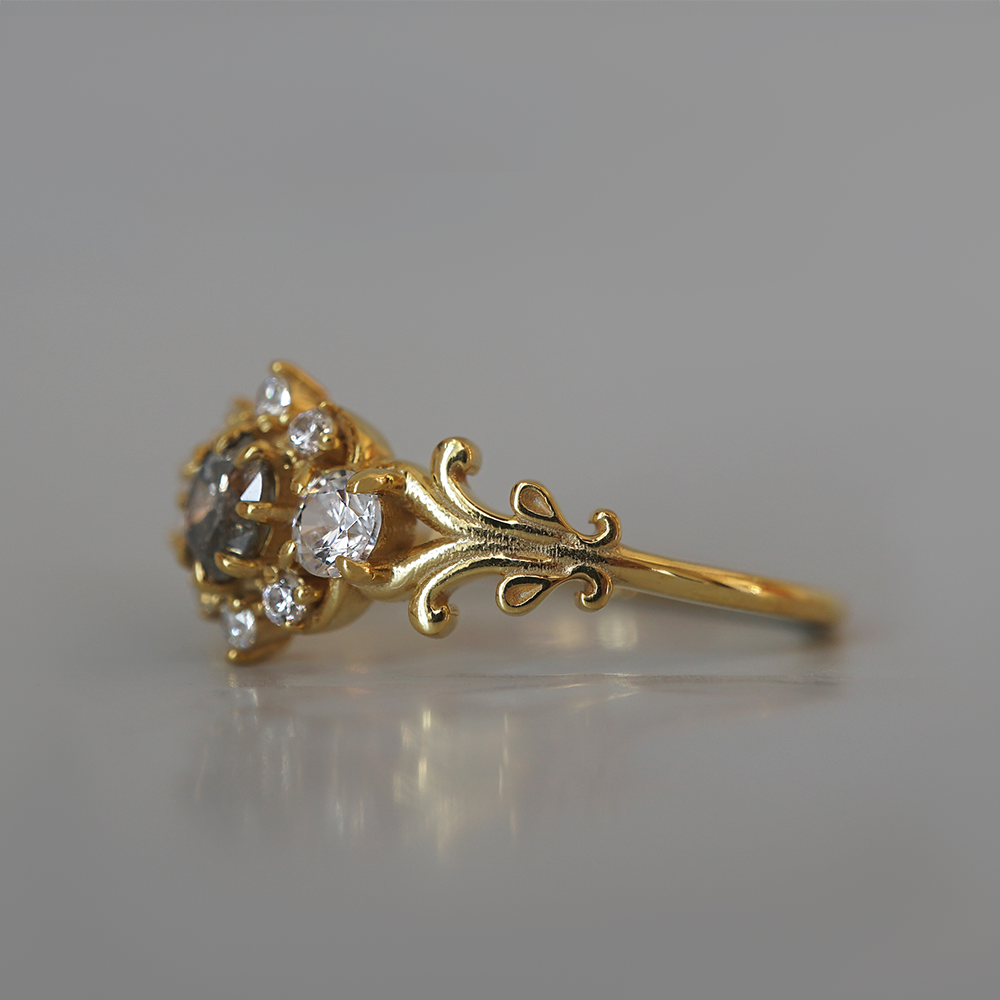 Wilderose is a delicate balance of shadow and bloom. At its center lies a salt and pepper diamond, full of quiet sparkle and mystery, surrounded by a cluster of white diamonds like scattered petals. The gold band is adorned with ornate, vintage-inspired scrollwork, echoing the curves of wild vines and hidden garden gates. Handcrafted in your choice of 14K and 18K Gold.