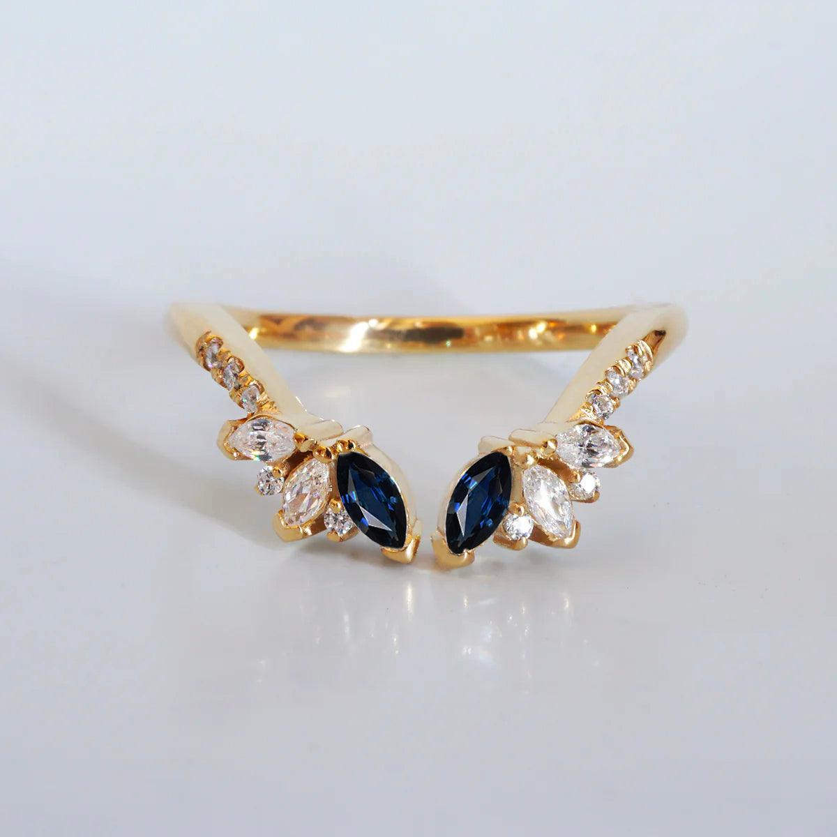 The Divine Wing ring features two natural dark blue sapphires, and sparkly white marquise and round diamonds. This ring is perfect to wear alone or paired with other rings. Available in 14K and 18K yellow gold, rose gold, and white gold with CZ or natural white diamonds. This ring is designed and handcrafted in NYC.