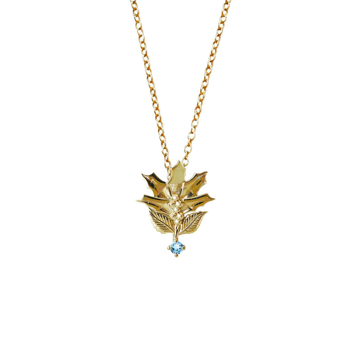 The December Birth Flower Necklace features the festive Holly, symbolizing protection, peace, and goodwill. Paired with a cool blue topaz birthstone, this pendant glows with winter’s crisp serenity.