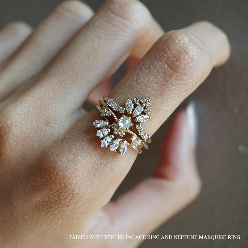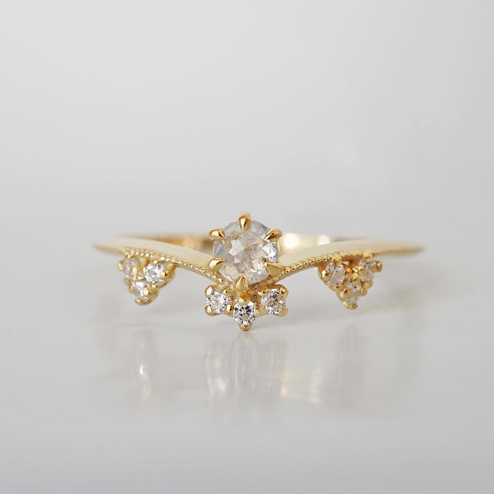 The Fairy Salt & Pepper Diamond Ring feels like a little piece of magic you can wear. At its center shimmers a natural salt and pepper diamond, each one uniquely speckled with its own universe of shadows and light. Paired with white diamonds or CZ, the contrast creates a soft, enchanting sparkle—like dusk settling over a quiet forest.