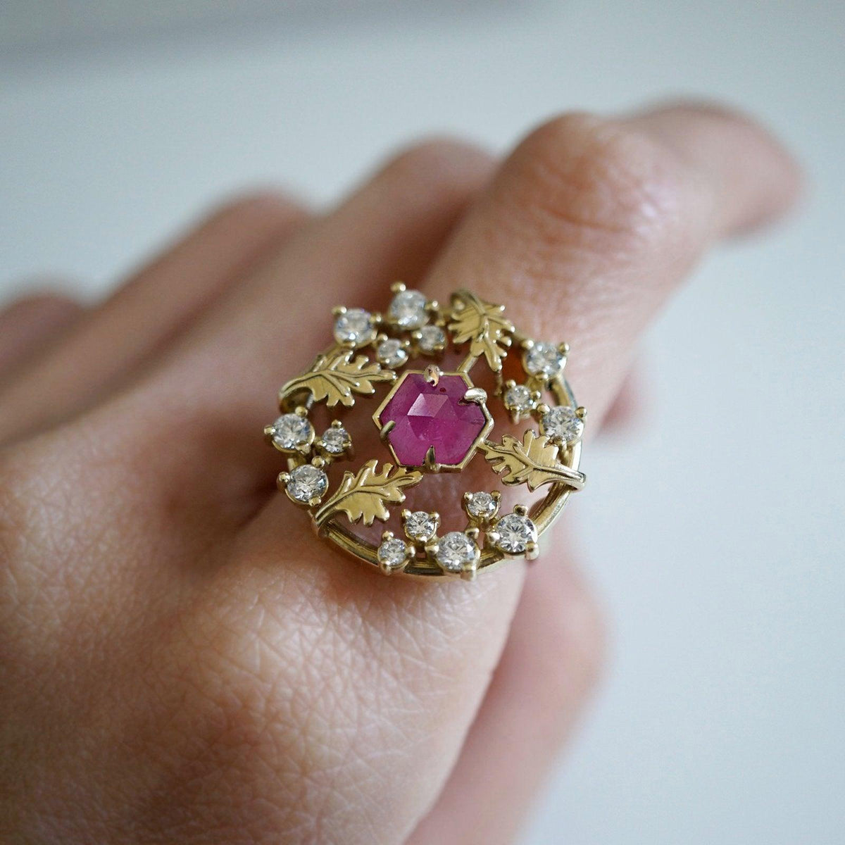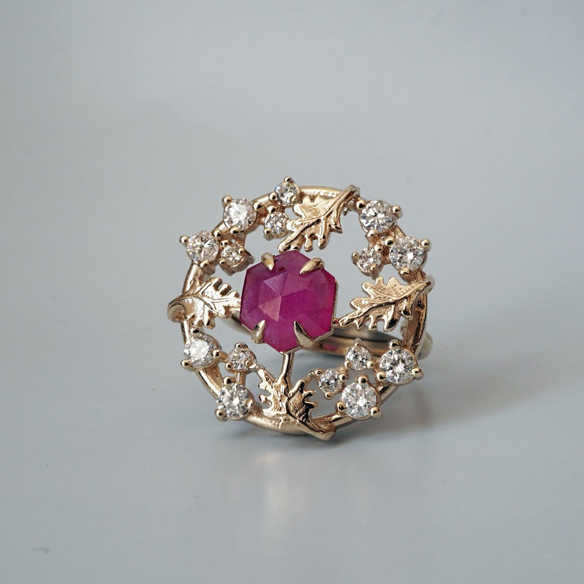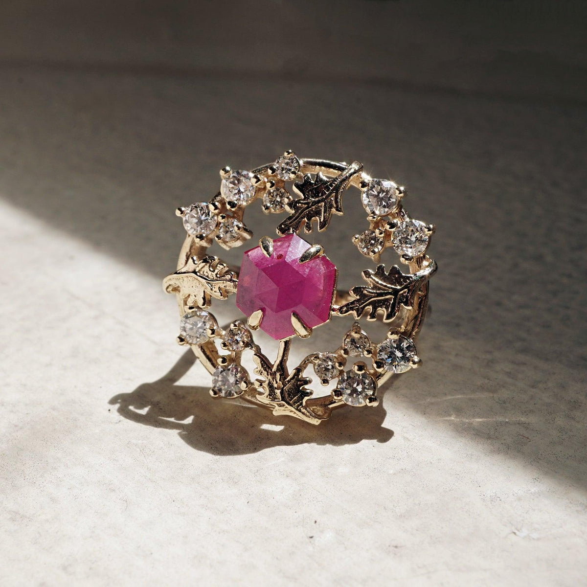 This one-of-a-kind ring is embellished with natural white diamonds like stars and features a stunning custom-cut hexagon-shaped natural ruby. This ring is designed and handcrafted in New York City.