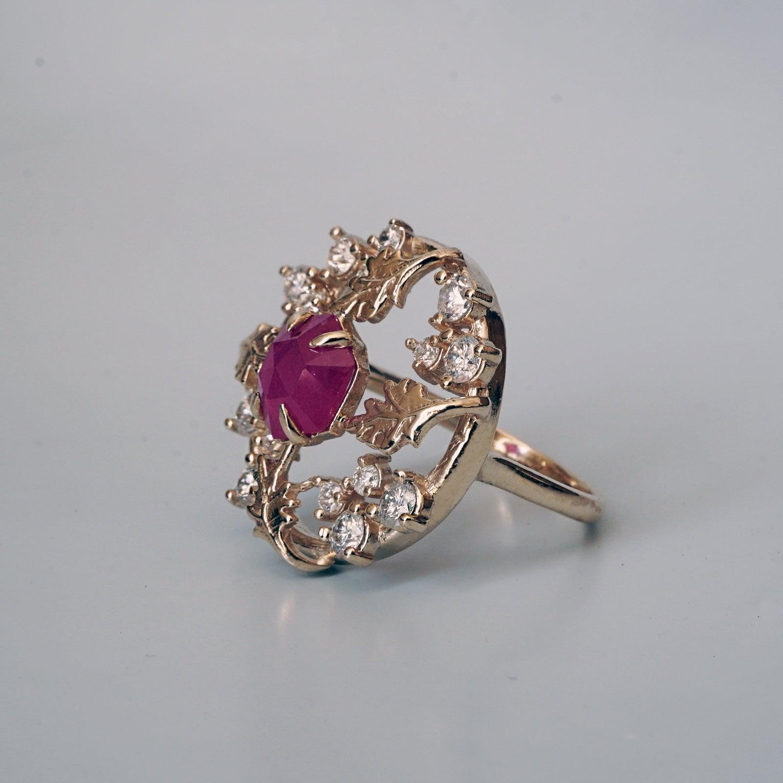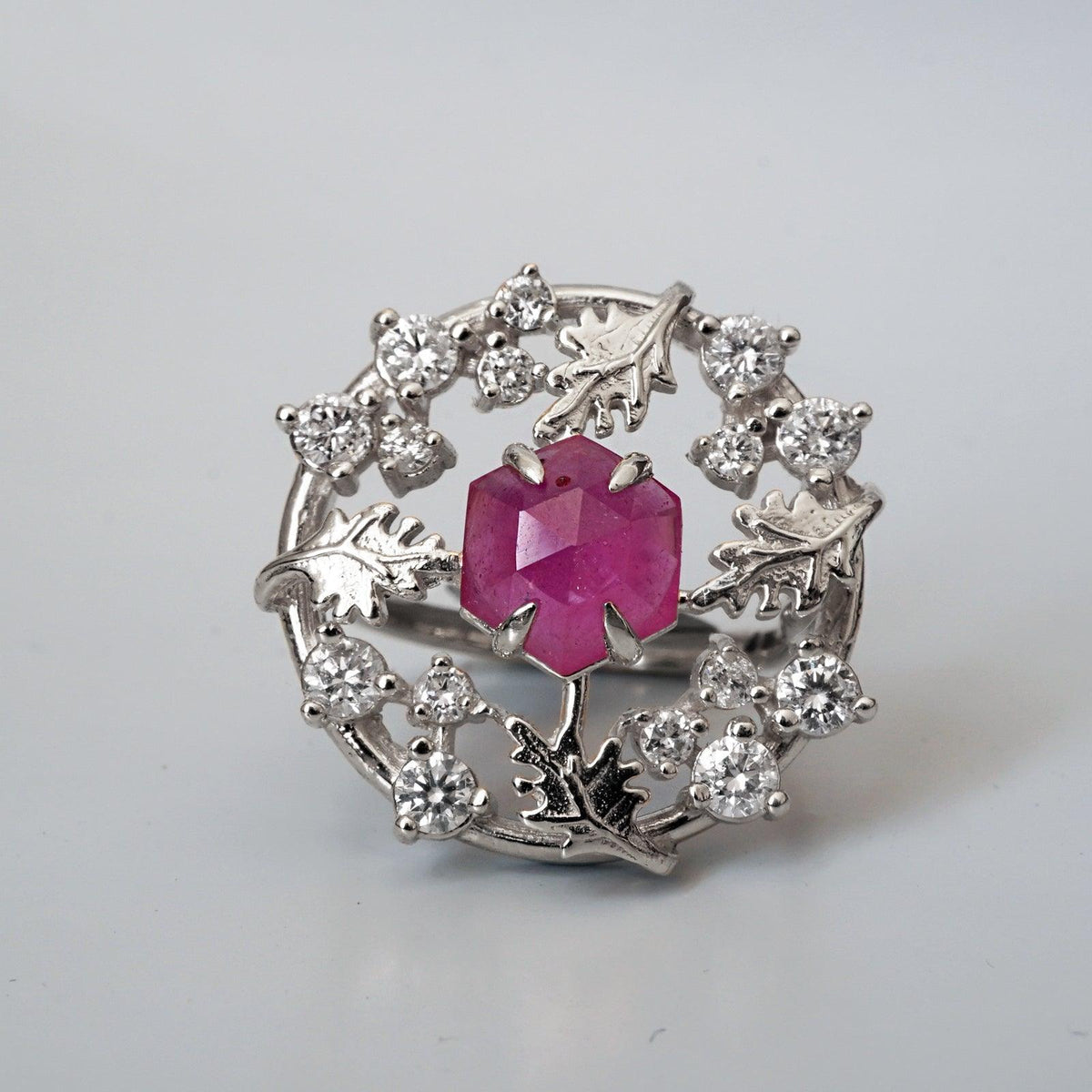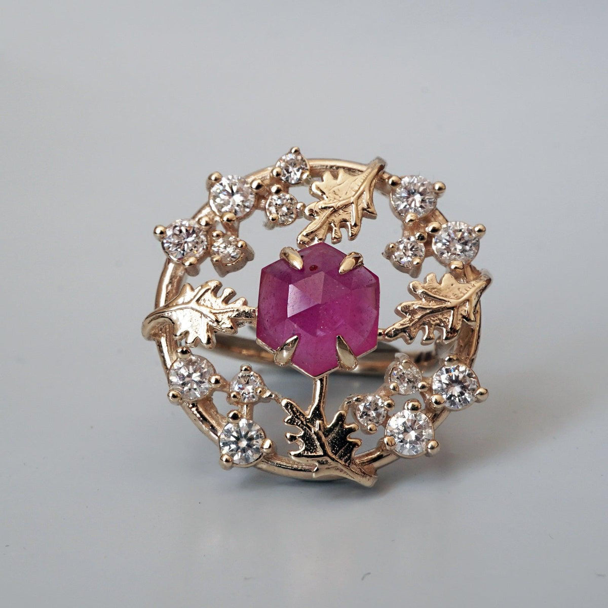 This one-of-a-kind ring is embellished with natural white diamonds like stars and features a stunning custom-cut hexagon-shaped natural ruby. This ring is designed and handcrafted in New York City.