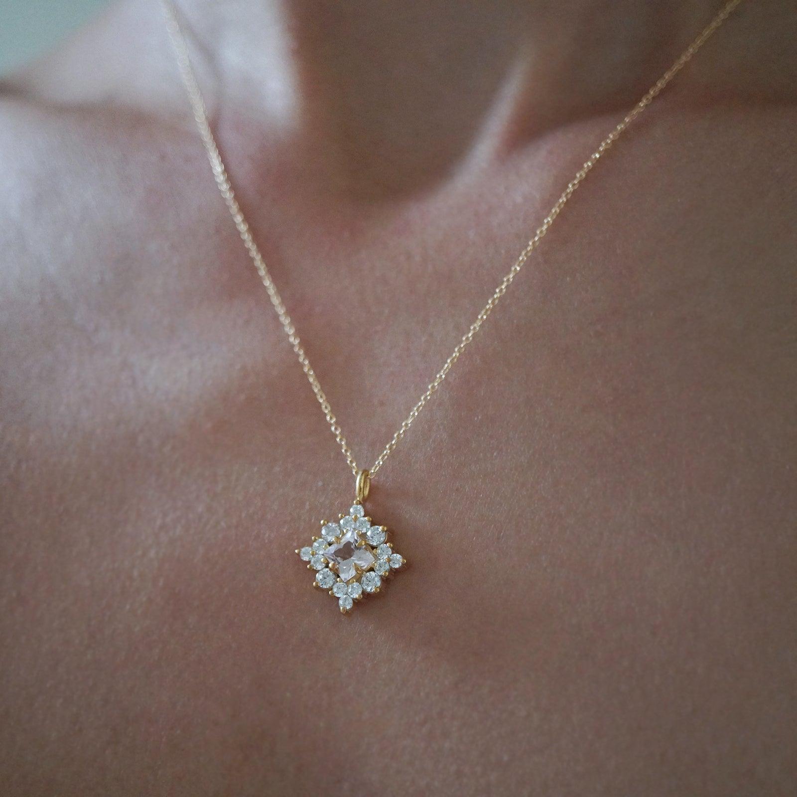 Named after the Aphrodite Goddess, this ring symbolize sexual love and beauty. The Aphrodite woman is graceful, passionate, and possesses a strong seduction about her. The necklace features a natural princess cut morganite center stone, surrounded by natural white diamonds or CZ. Available in 14K yellow gold, rose gold and white gold. Model is wearing 18" chain.