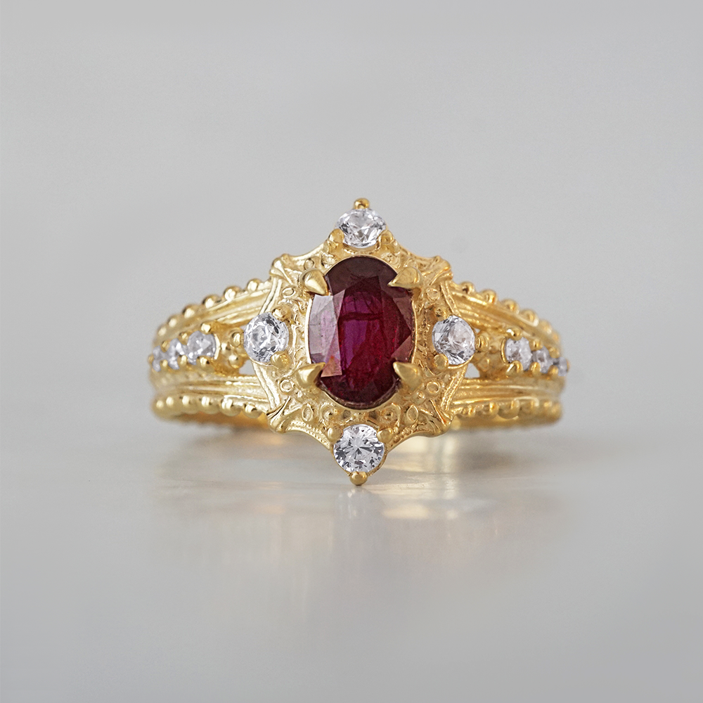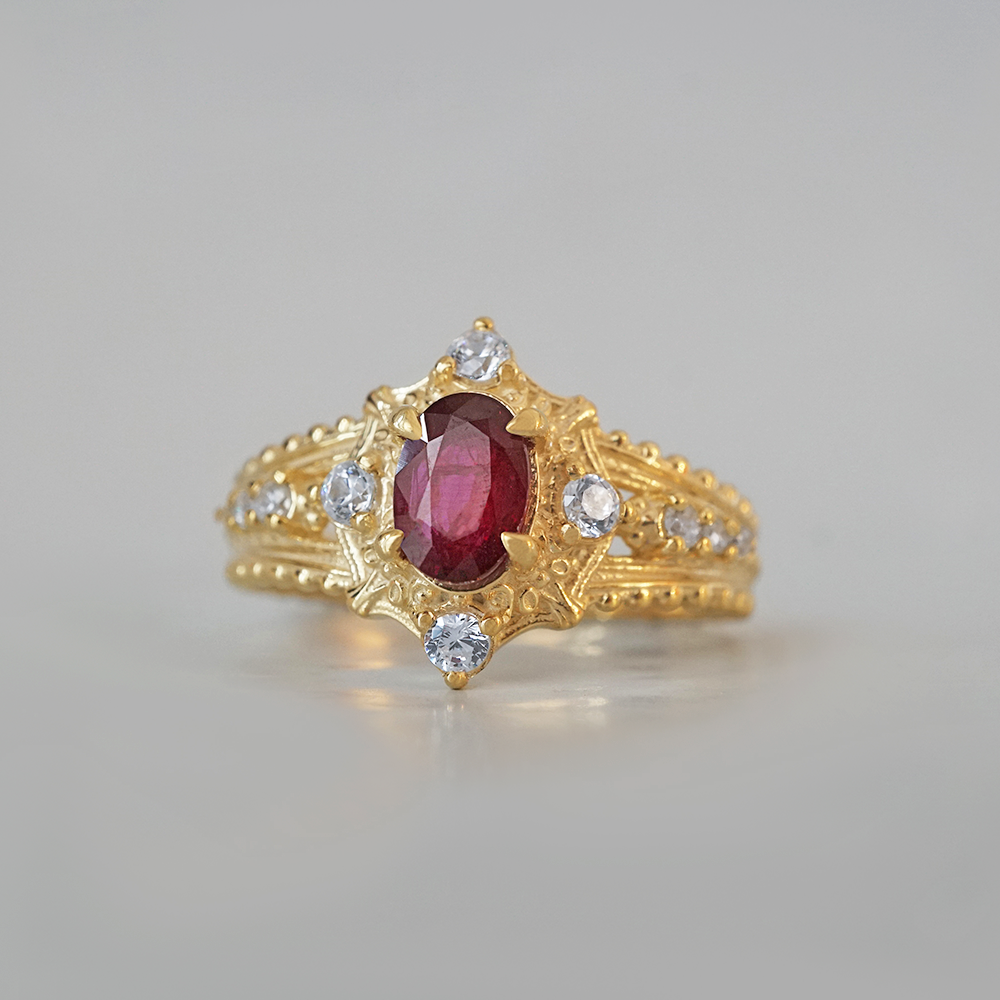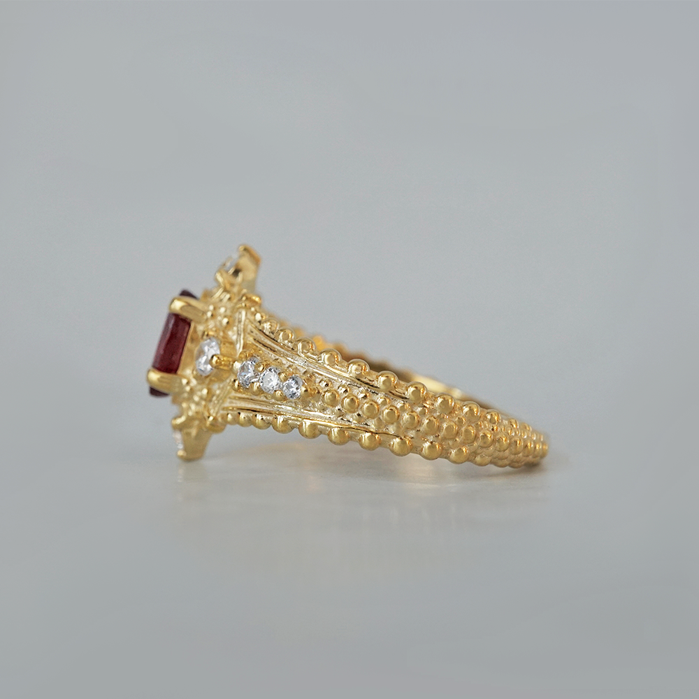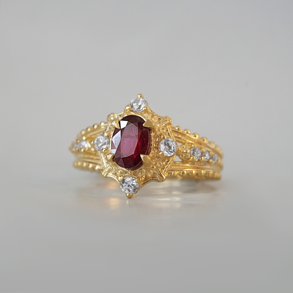 The Coronette Ruby Ring is an ode to quiet royalty, inspired by antique coronets worn not for ceremony, but for legacy. At its heart rests a rich natural ruby, glowing with depth and warmth, framed by luminous diamonds and sculpted gold details that echo old-world craftsmanship.