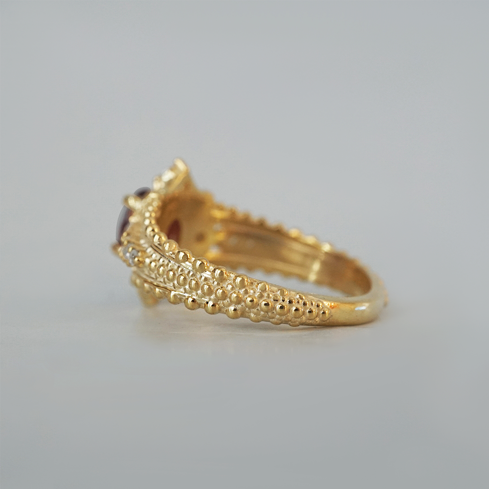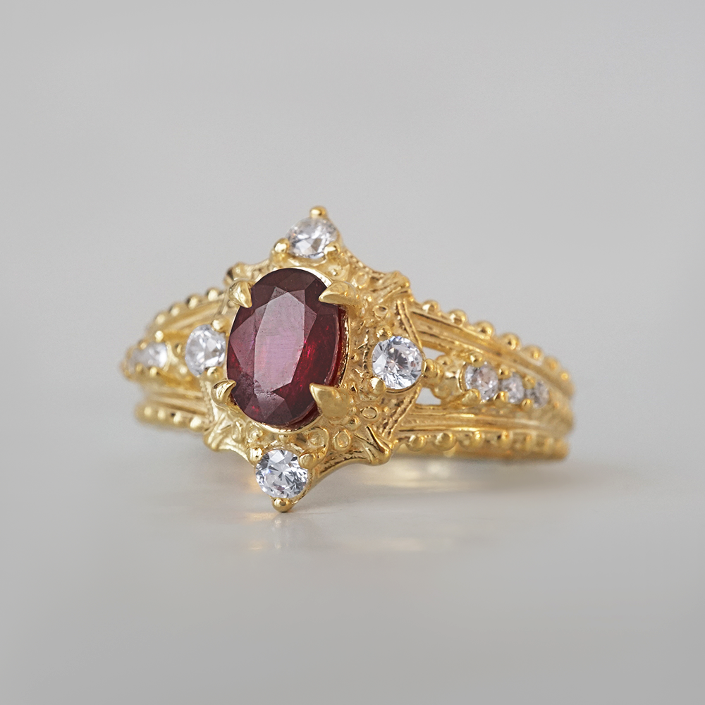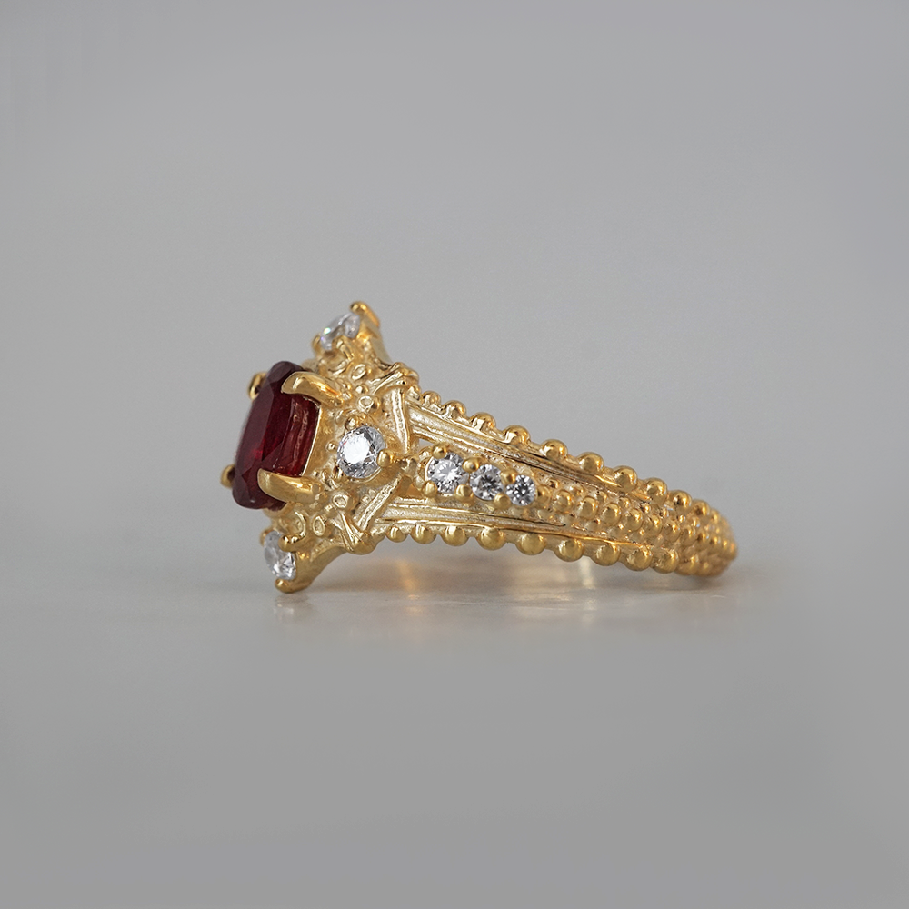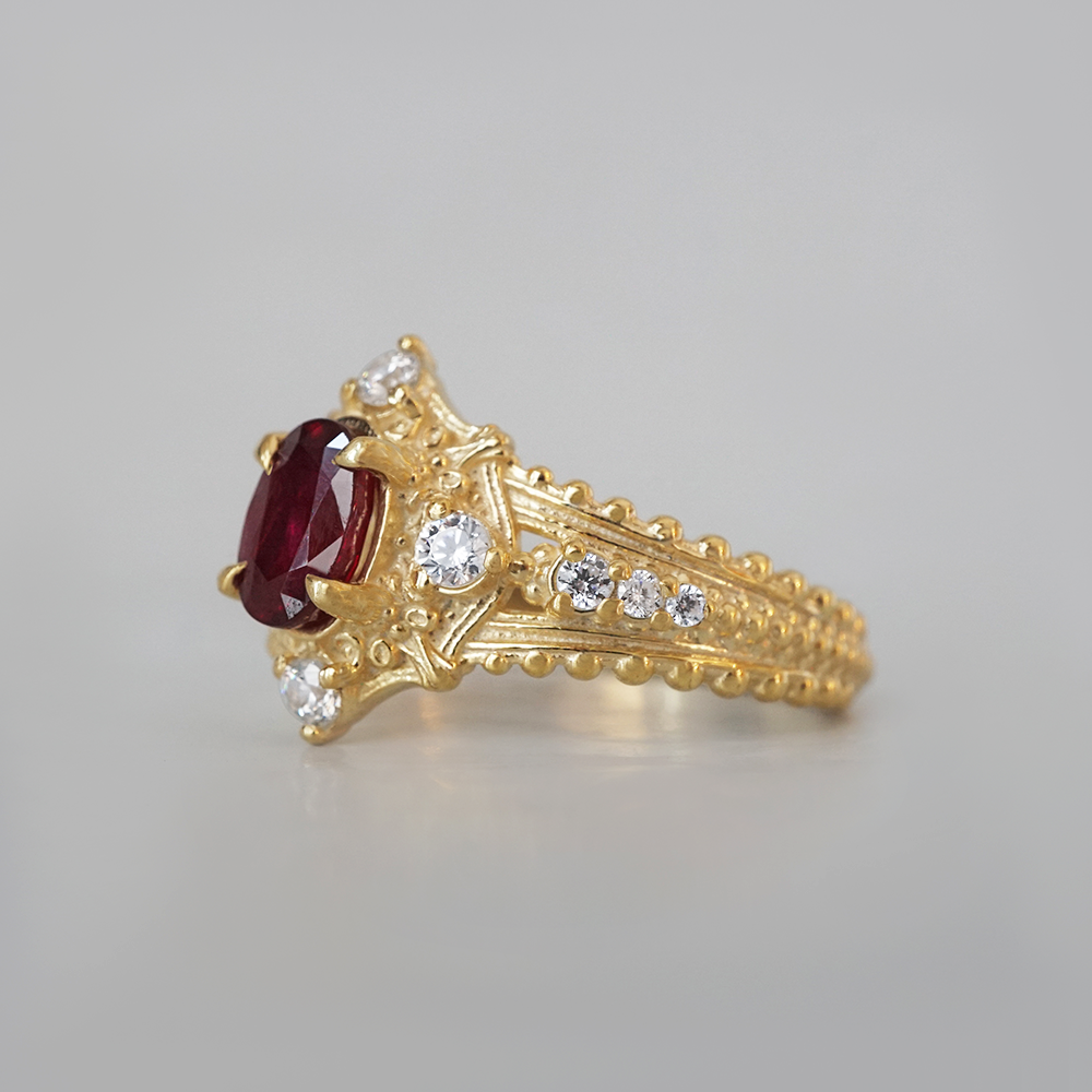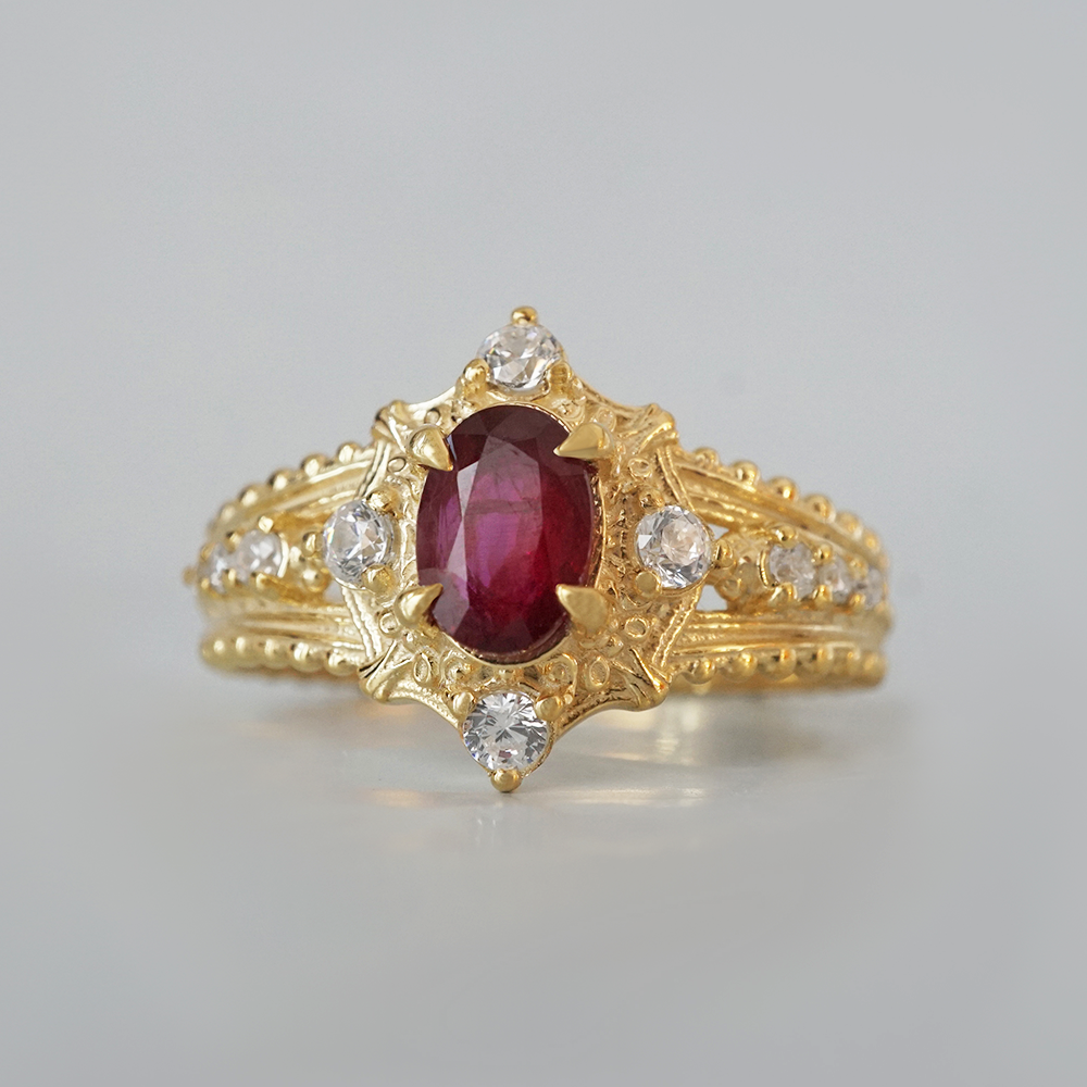 The Coronette Ruby Ring is an ode to quiet royalty, inspired by antique coronets worn not for ceremony, but for legacy. At its heart rests a rich natural ruby, glowing with depth and warmth, framed by luminous diamonds and sculpted gold details that echo old-world craftsmanship.