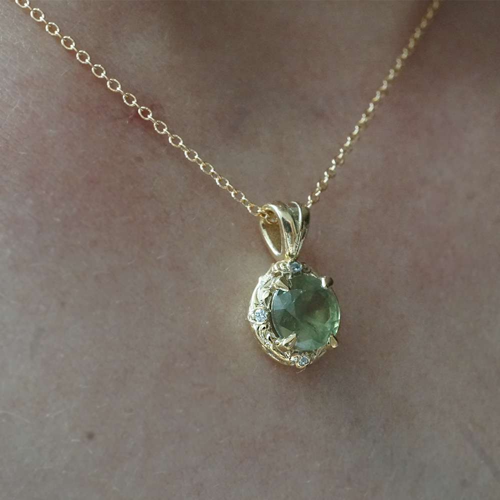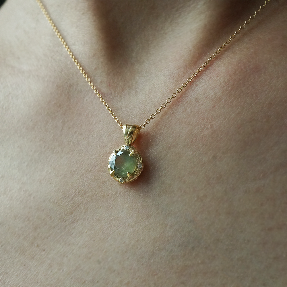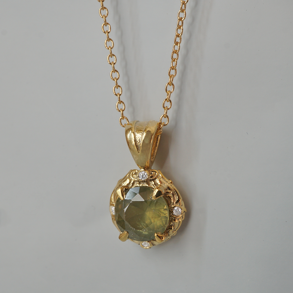 Encircled by soft, feminine curves inspired by meadow vines, the pendant evokes the tranquility of a sunlit field in bloom. The round design highlights the gemstone’s natural sparkle, making it a timeless expression of elegance and balance.