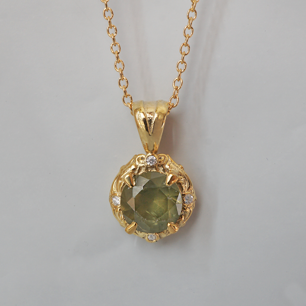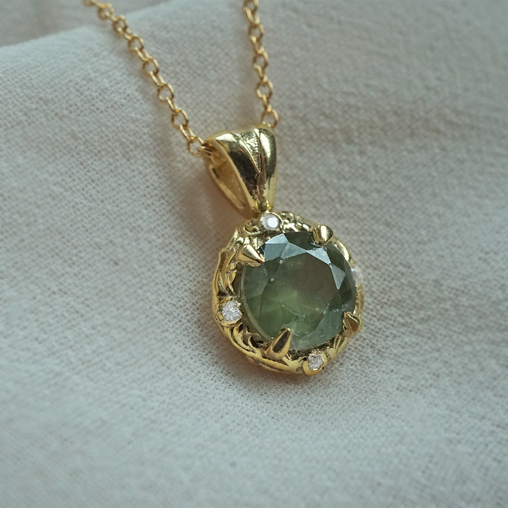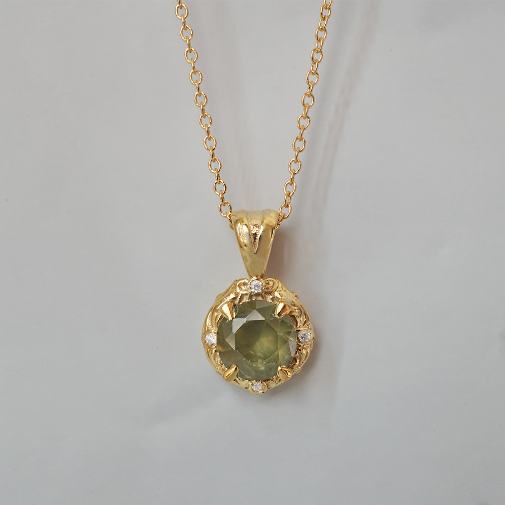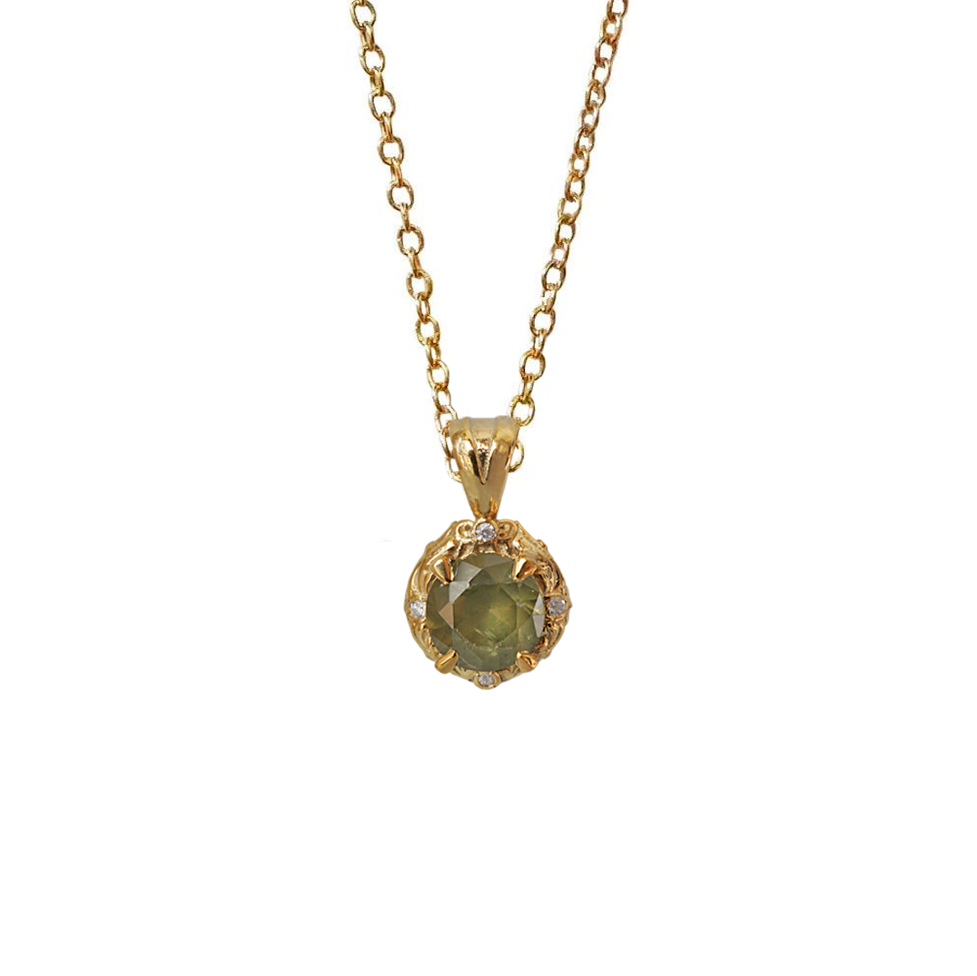 Unveil the enchanting beauty of the Meadow Necklace, a poetic tribute to nature’s grace and renewal. At its heart lies a radiant demantoid garnet. Believed to bring strength, prosperity, and vitality.