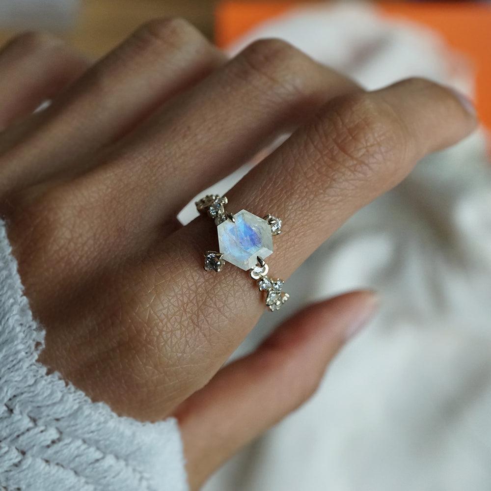 The Hexagon Moonstone Luna Ring is a dreamy reminder of the night sky—soft, luminous, and full of quiet magic. At its center rests a custom-cut hexagonal moonstone, glowing with ethereal flashes of blue that shift like moonlight on water.