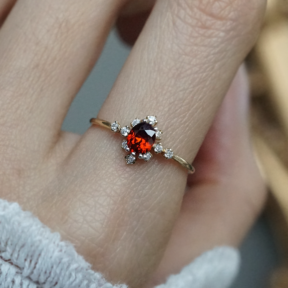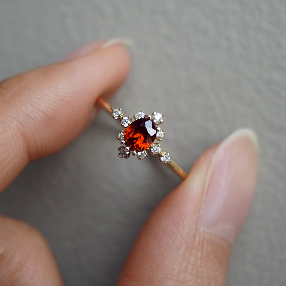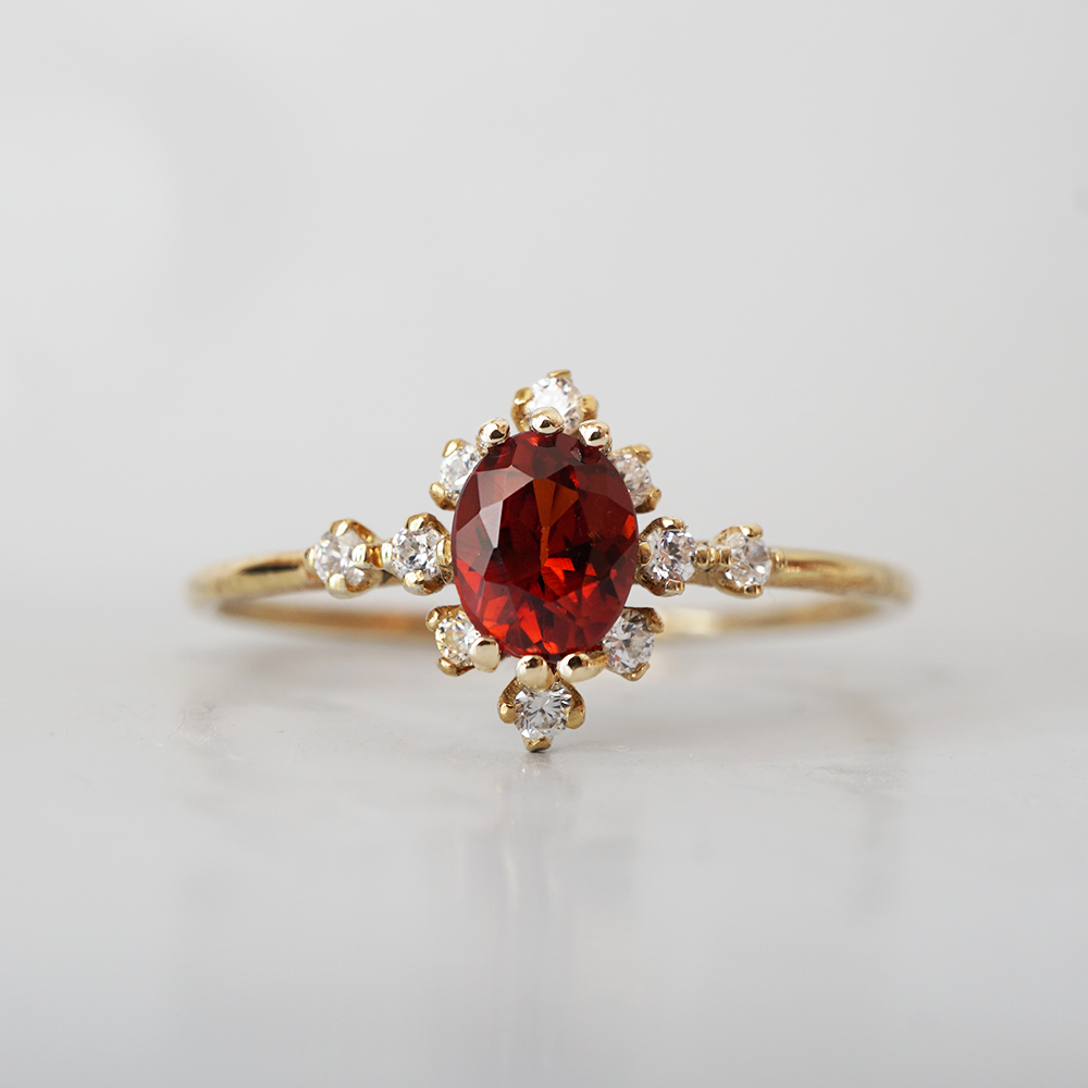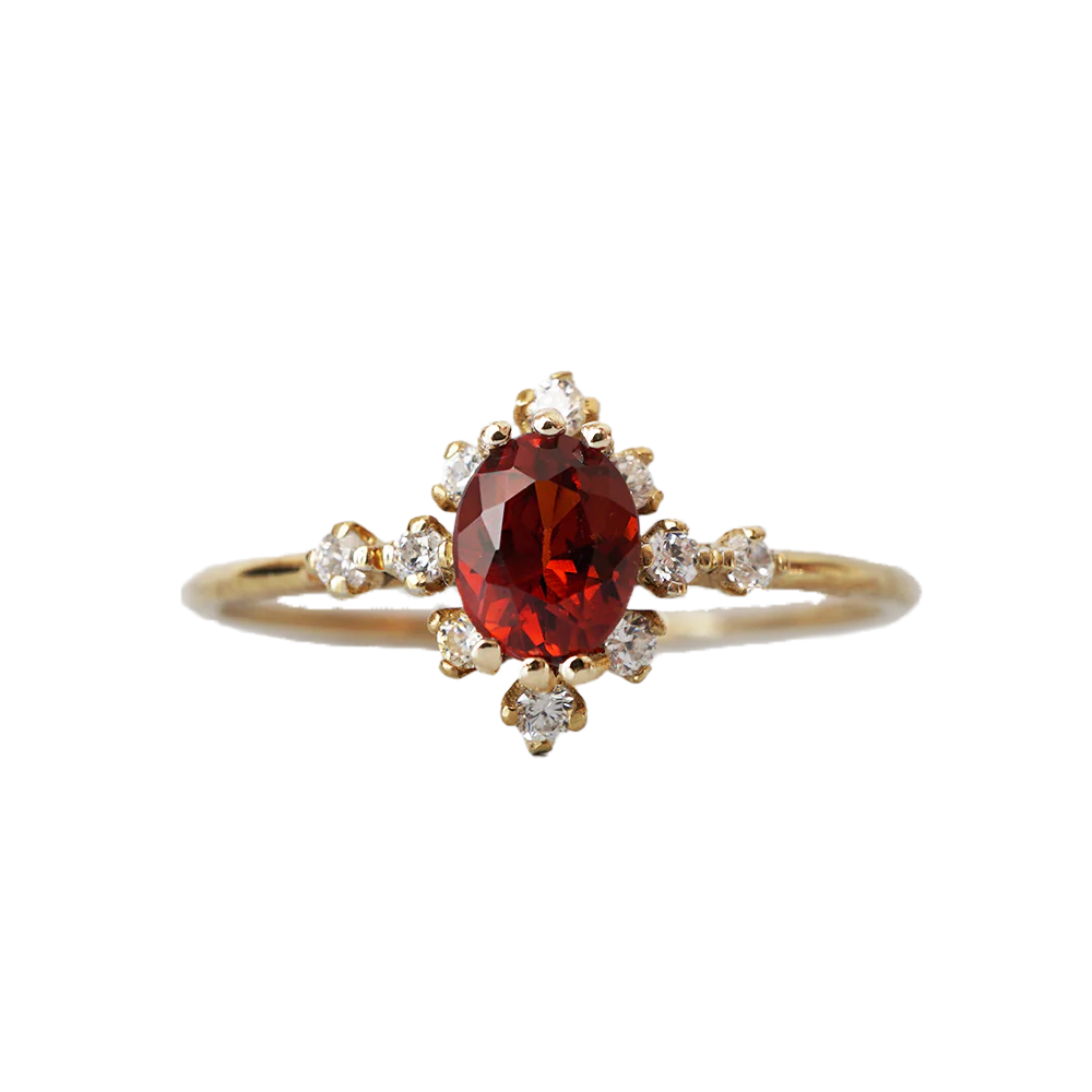 The Oval Red Spinel Darling Ring radiates warmth and elegance with its striking natural, eye-clean red spinel at the center. Handcrafted in solid 14K gold, this dainty ring is adorned with sparkling natural white diamonds or CZ, creating a refined and romantic look that captures the essence of timeless beauty.