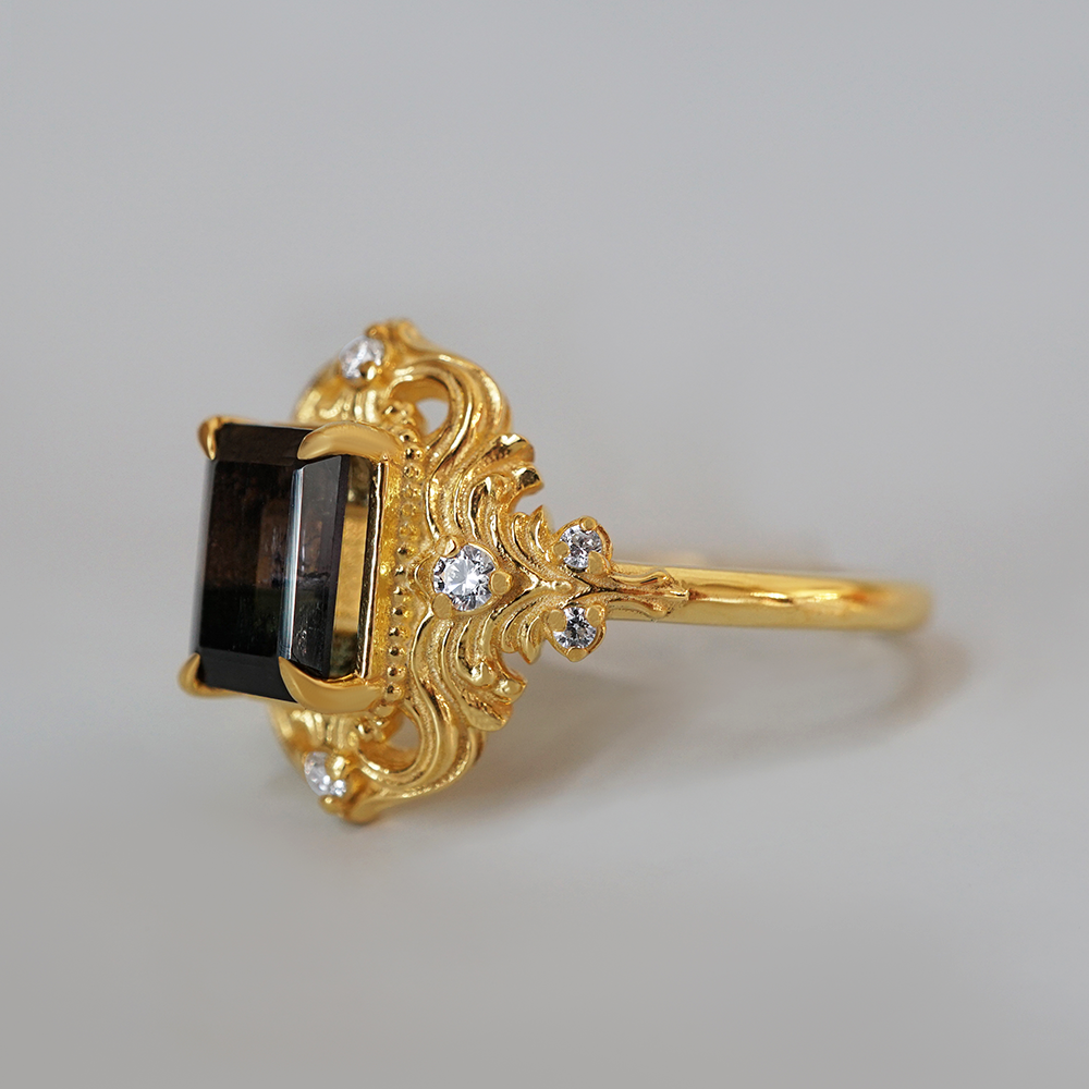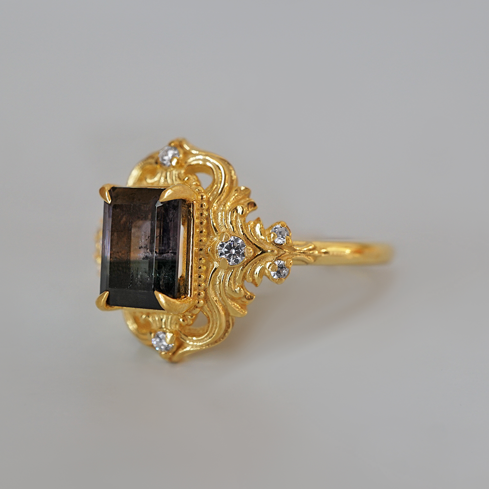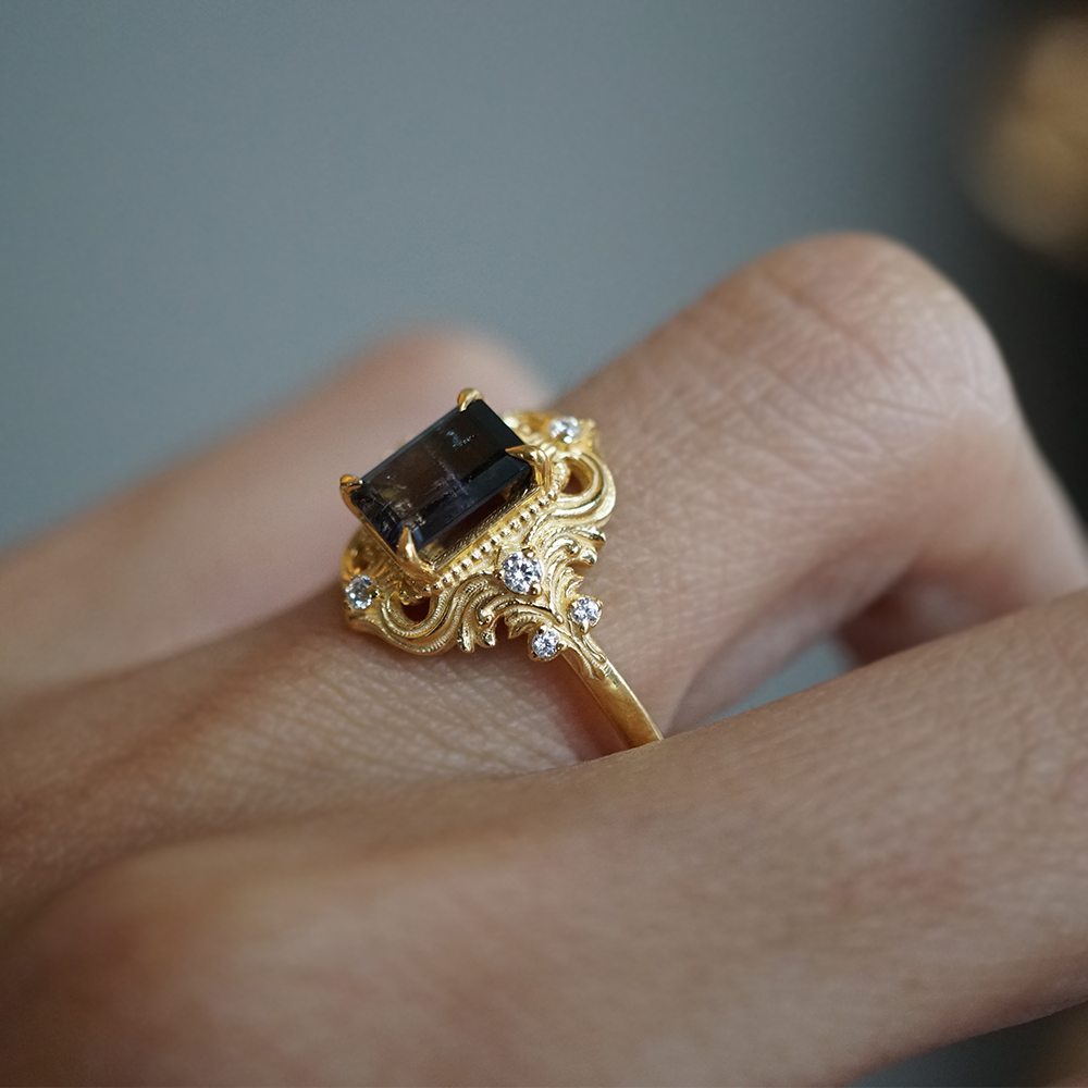 Intricately sculpted with baroque-inspired goldwork, this piece evokes the grandeur of old-world architecture and the romance of candlelit evenings. Every curve and flourish reflects the artistry of a ring born from light, mystery, and timeless allure.