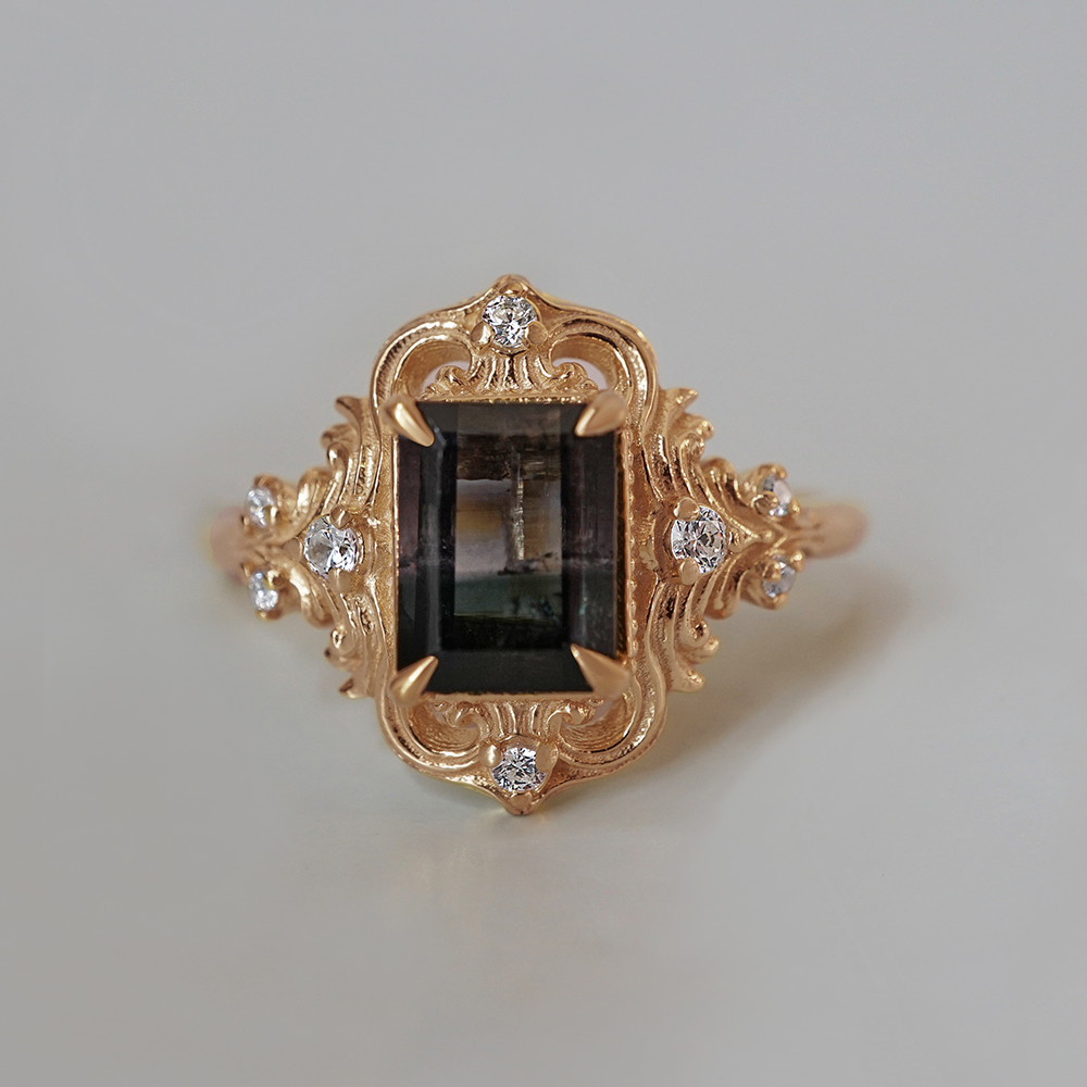 Meaning “House of Evening” in French, the Maison du Soir Ring captures the quiet poetry of twilight — that fleeting moment when day melts into night. At its center glows a natural bicolor tourmaline, its hues shifting like dusk skies between dark violet and shadow black, framed by sparkling natural white diamonds.