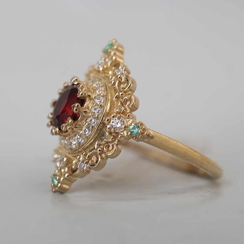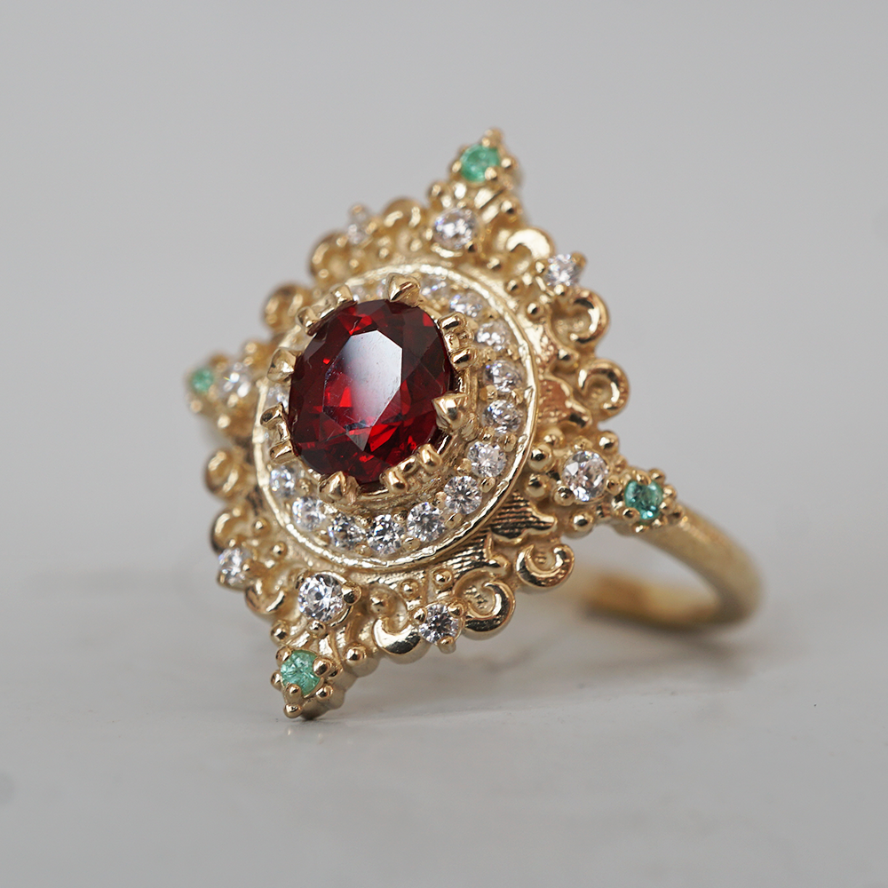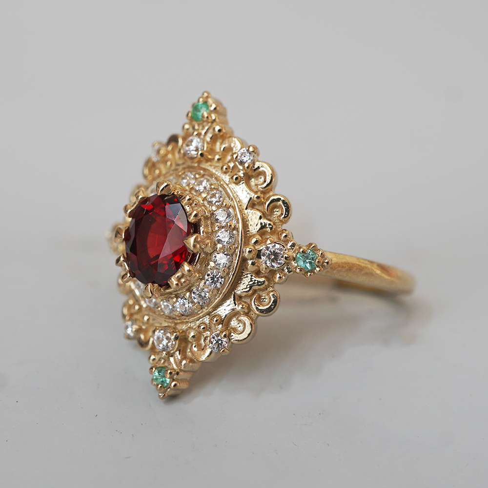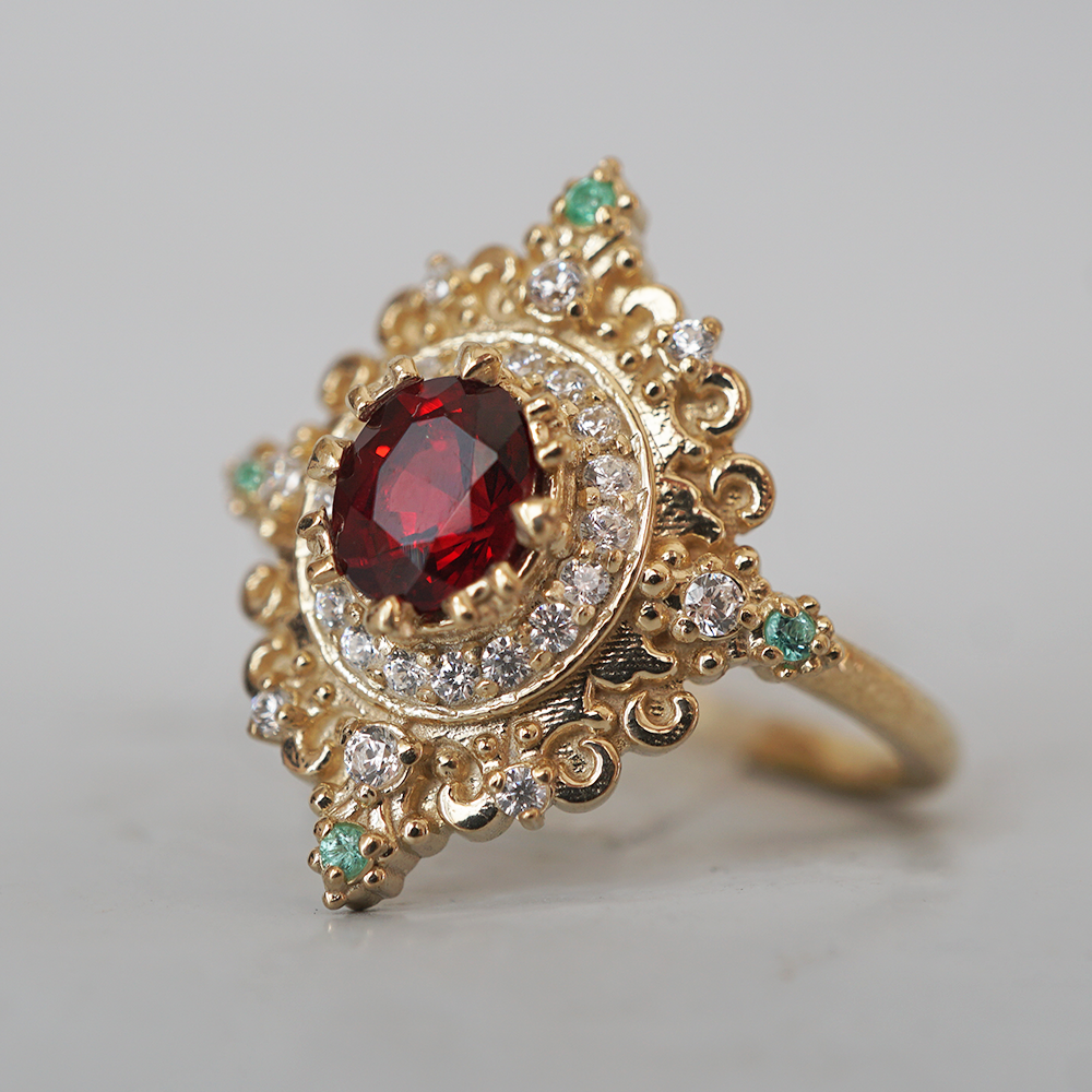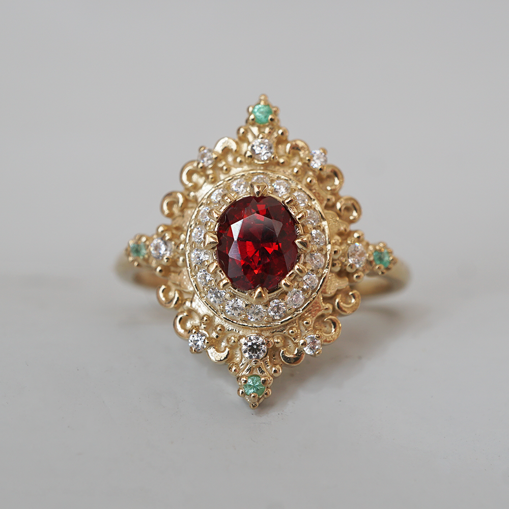 The gold setting is richly sculpted in a style reminiscent of antique religious relics and baroque ornamentation—scrolls, symmetry, and light-catching curves that feel both royal and devotional. It’s not just a ring; it’s a symbol of passion, of prayer, of something timeless and true. Rosarium is for the soul who believes love is sacred, and beauty is a form of reverence. A jewel to hold close like a whispered vow.