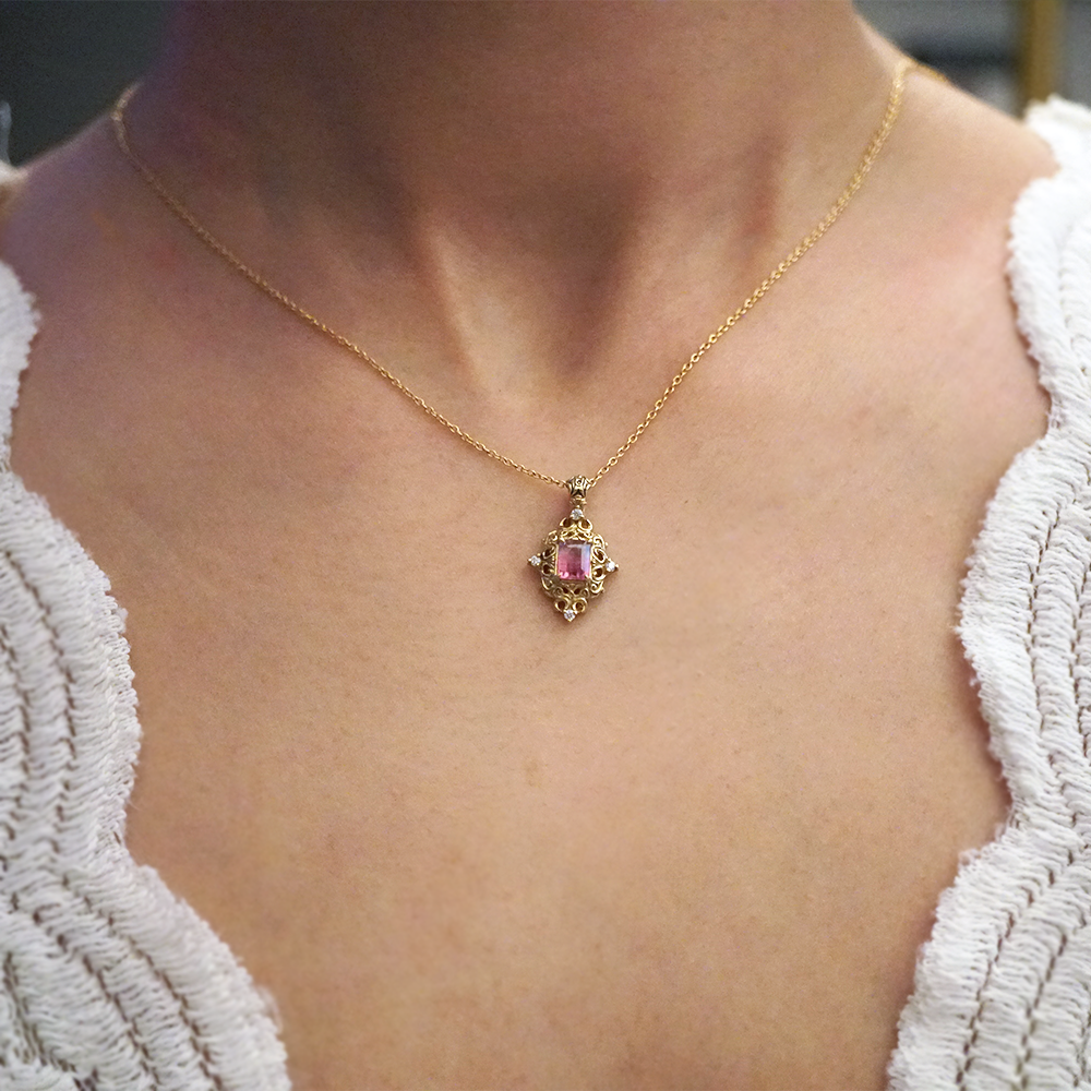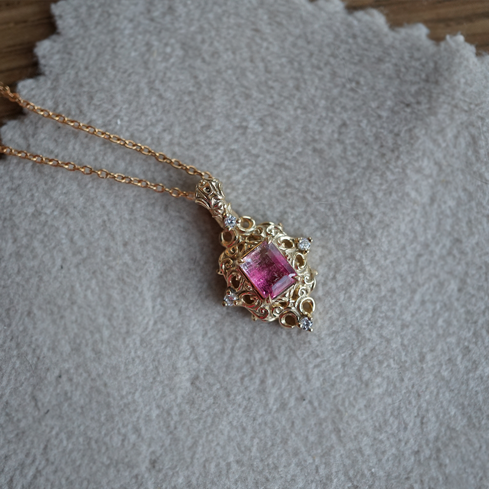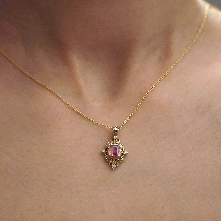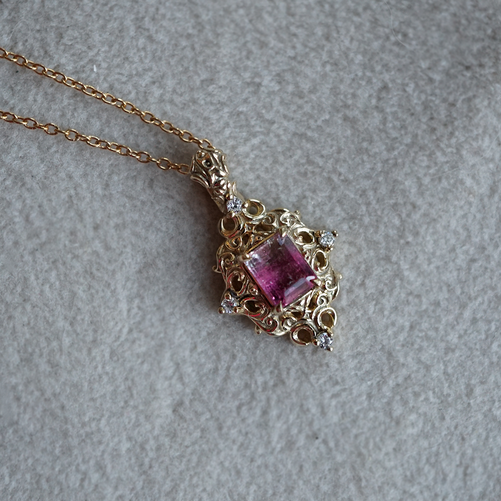 This Watermelon Tourmaline Filigree Diamond Necklace embodies dainty elegance and timeless femininity. At its heart rests a natural watermelon tourmaline, radiating soft pink and green hues that evoke warmth and serenity. The gemstone is framed by intricate gold filigree detailing and sparkling accent diamonds, adding vintage sophistication to its delicate allure.
