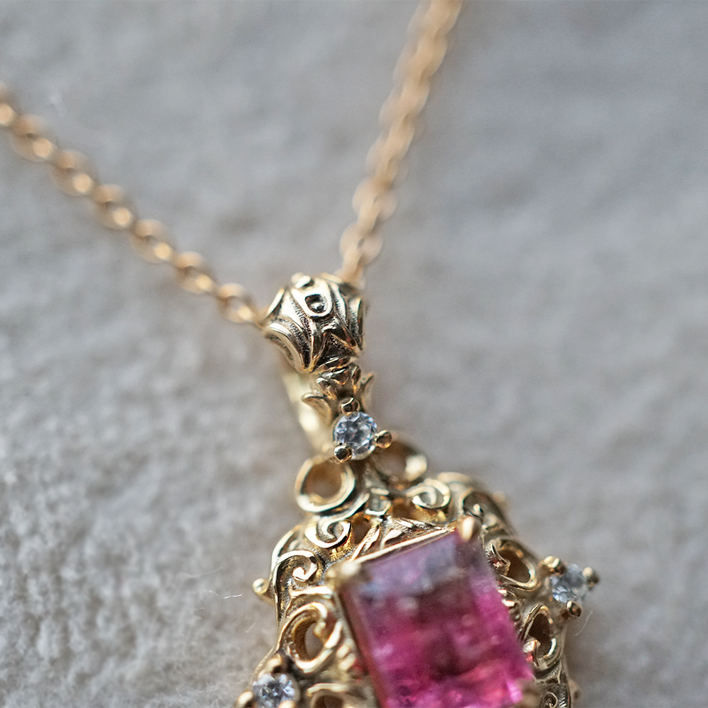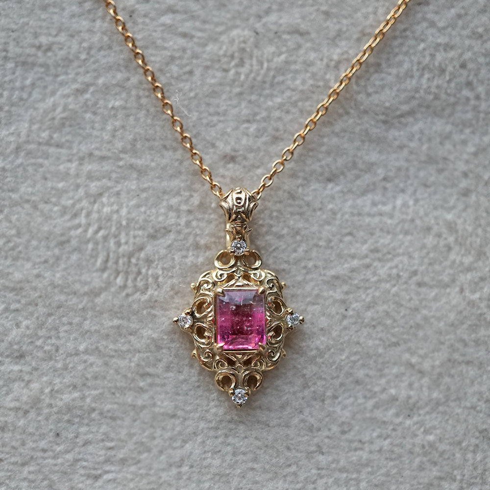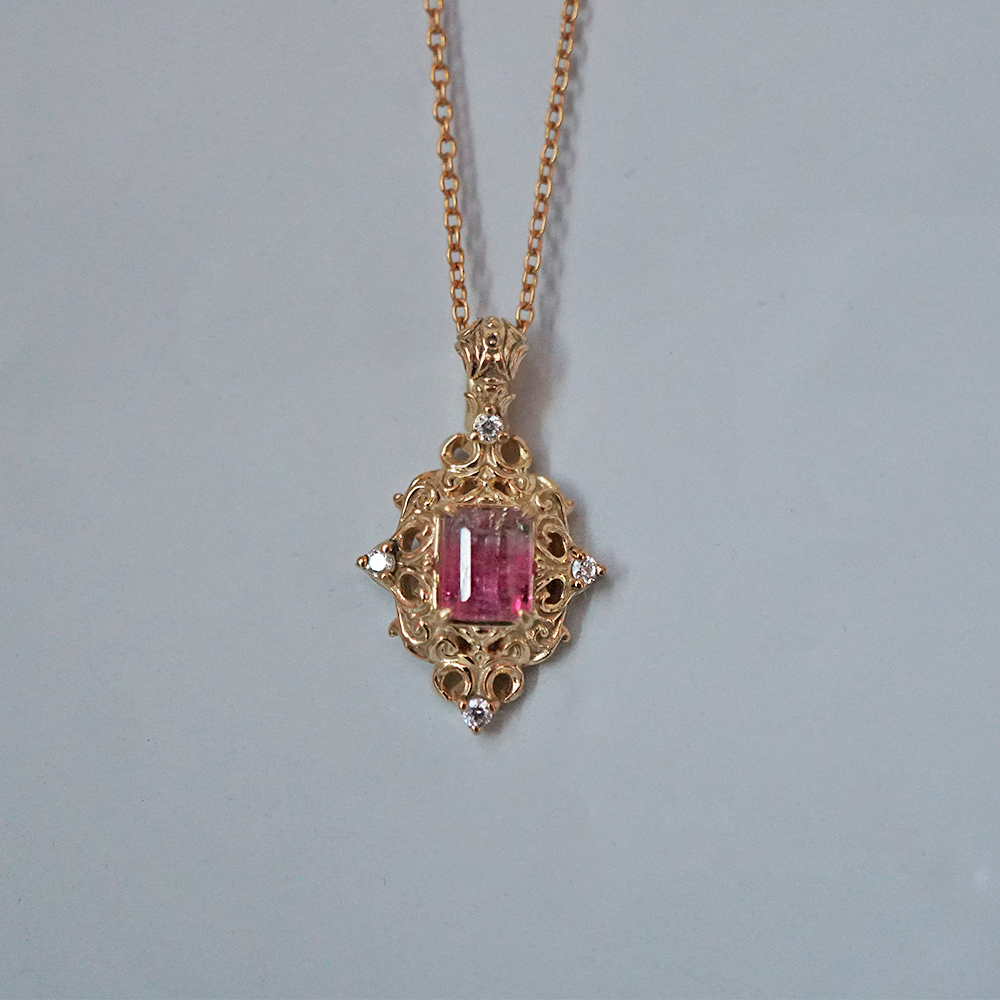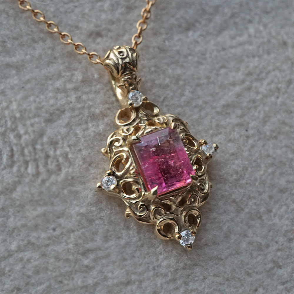 This Watermelon Tourmaline Filigree Diamond Necklace embodies dainty elegance and timeless femininity. At its heart rests a natural watermelon tourmaline, radiating soft pink and green hues that evoke warmth and serenity. The gemstone is framed by intricate gold filigree detailing and sparkling accent diamonds, adding vintage sophistication to its delicate allure.