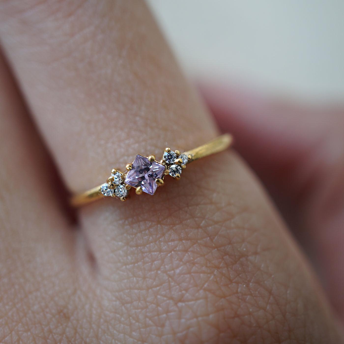 A pink sapphire sits on a dainty band surrounded by a cluster of tiny czs. This ethereal pink palette makes a delicate timeless everyday piece. Available in sterling silver. Pink sapphire comes in shades of lavender and pink.