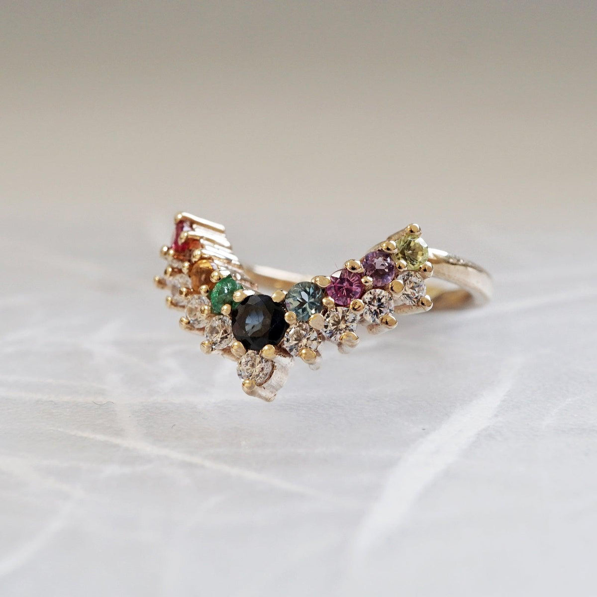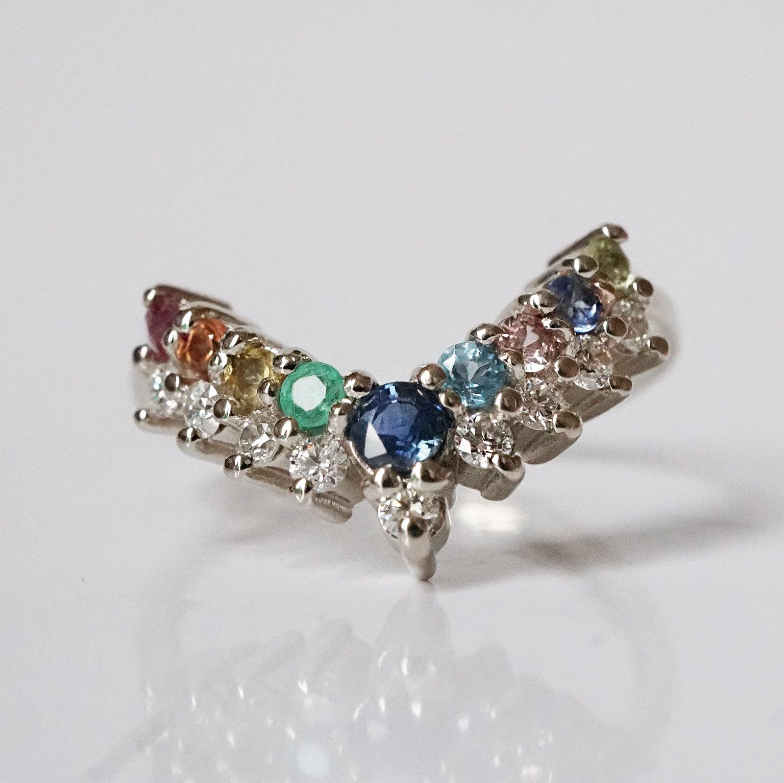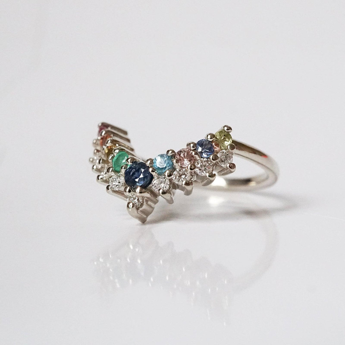 This ring features nine stunning colored natural gemstones, each representing a unique hue: ruby, orange sapphire, citrine, emerald, blue sapphire, blue topaz, pink sapphire, amethyst, and peridot. These colorful gems are gracefully encrusted with natural white diamonds, adding an extra sparkle that's as radiant as the rainbow itself.
