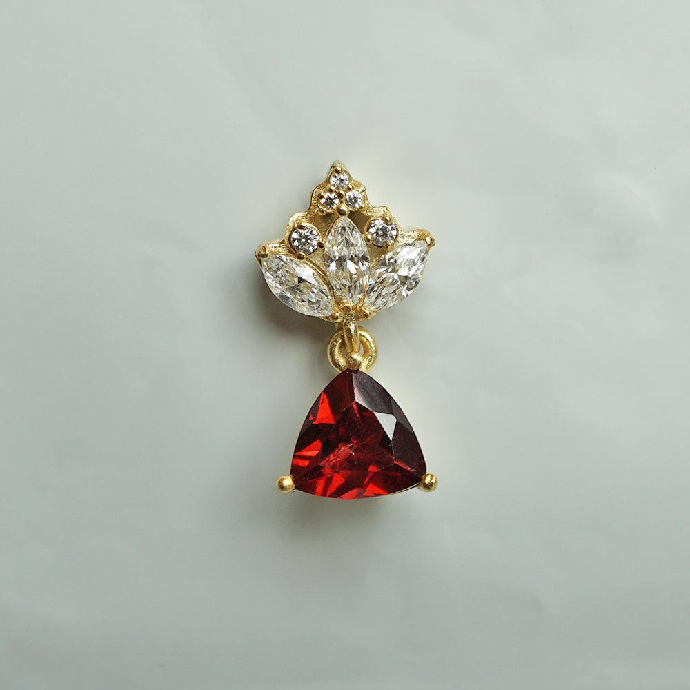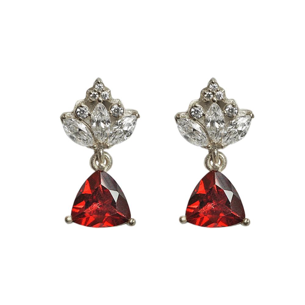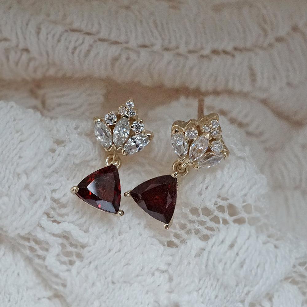 The Trillion Garnet Winter Earrings evoke warmth and beauty against the chill of winter. Each earring features a blood-red natural garnet cut into a radiant trillion shape, surrounded by a halo of sparkling CZ or diamonds that reflects light like fresh frost under firelight.