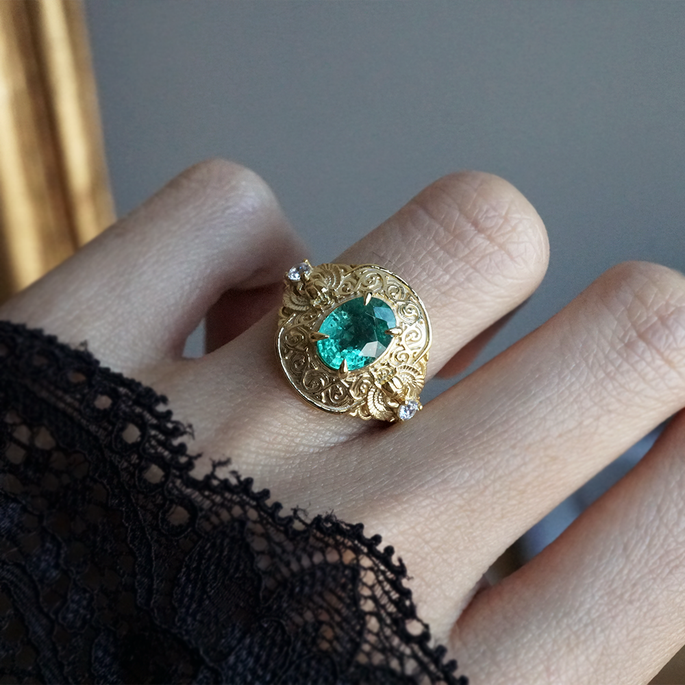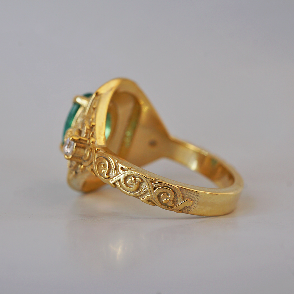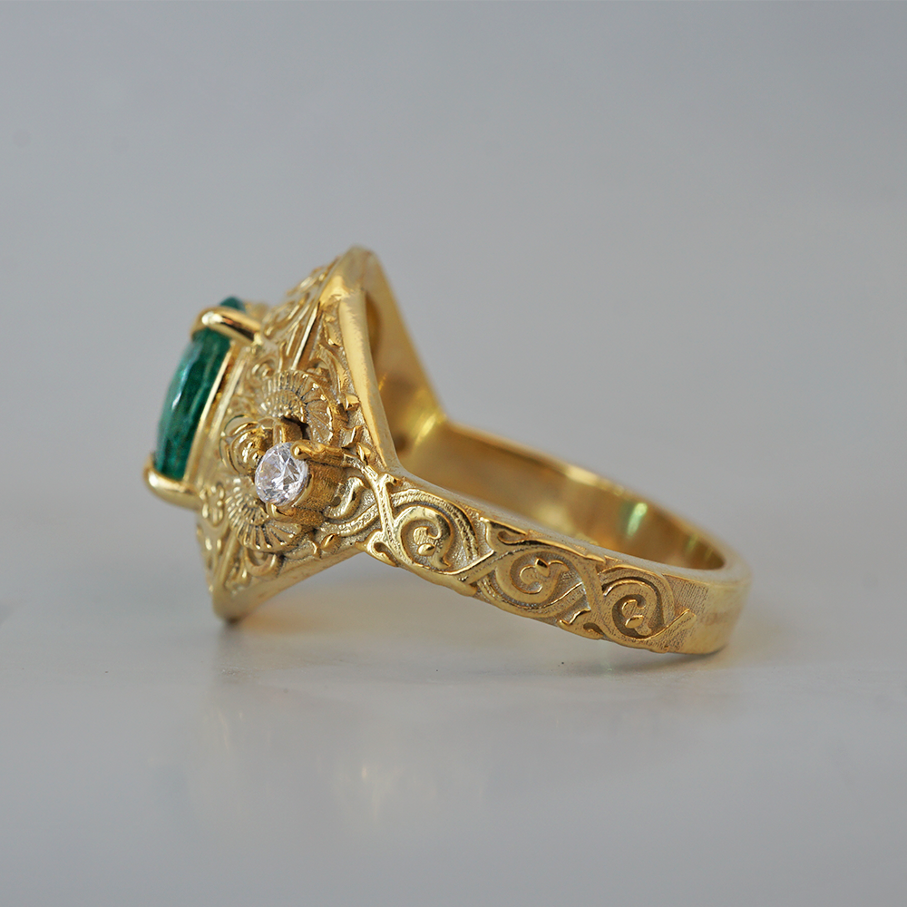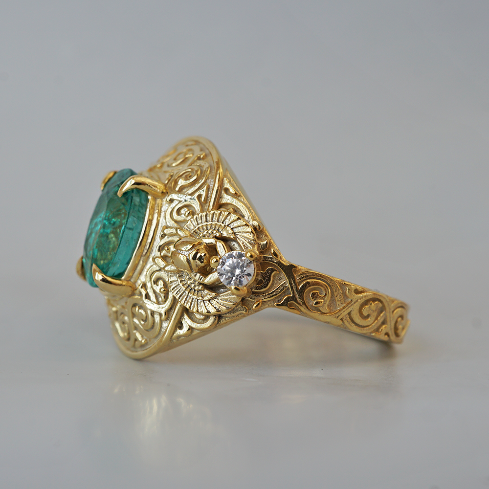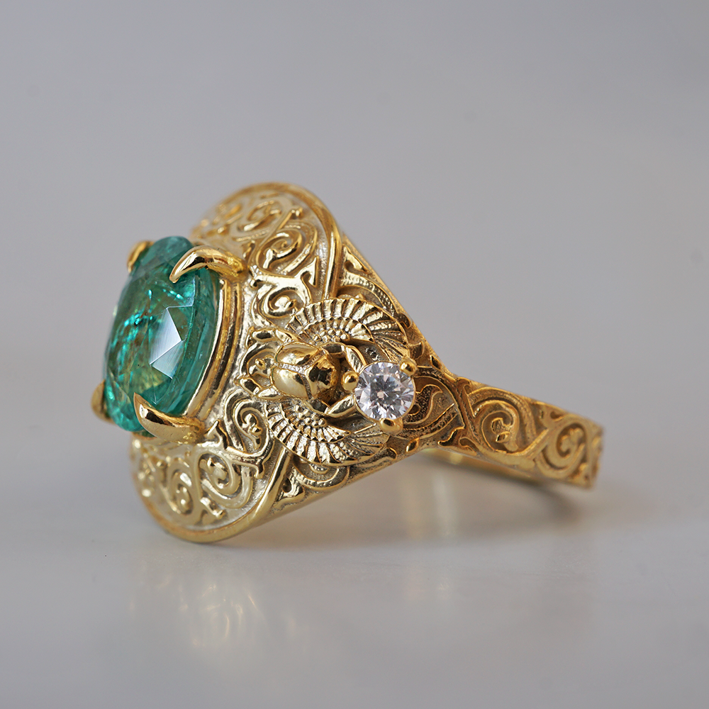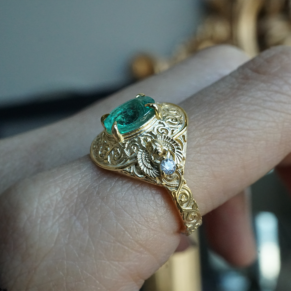 Introducing the "Emerald Scarab Ring" – a captivating blend of ancient Egyptian mystique and timeless elegance. Centered with a lush emerald framed by intricate Islamic patterns inspired by Egypt's architectural wonders, this ring evokes the opulence of ancient Egypt. Flanked by scarabs symbolizing rebirth, each holds a radiant diamond, echoing the sun's eternal sparkle on the Nile's waters.