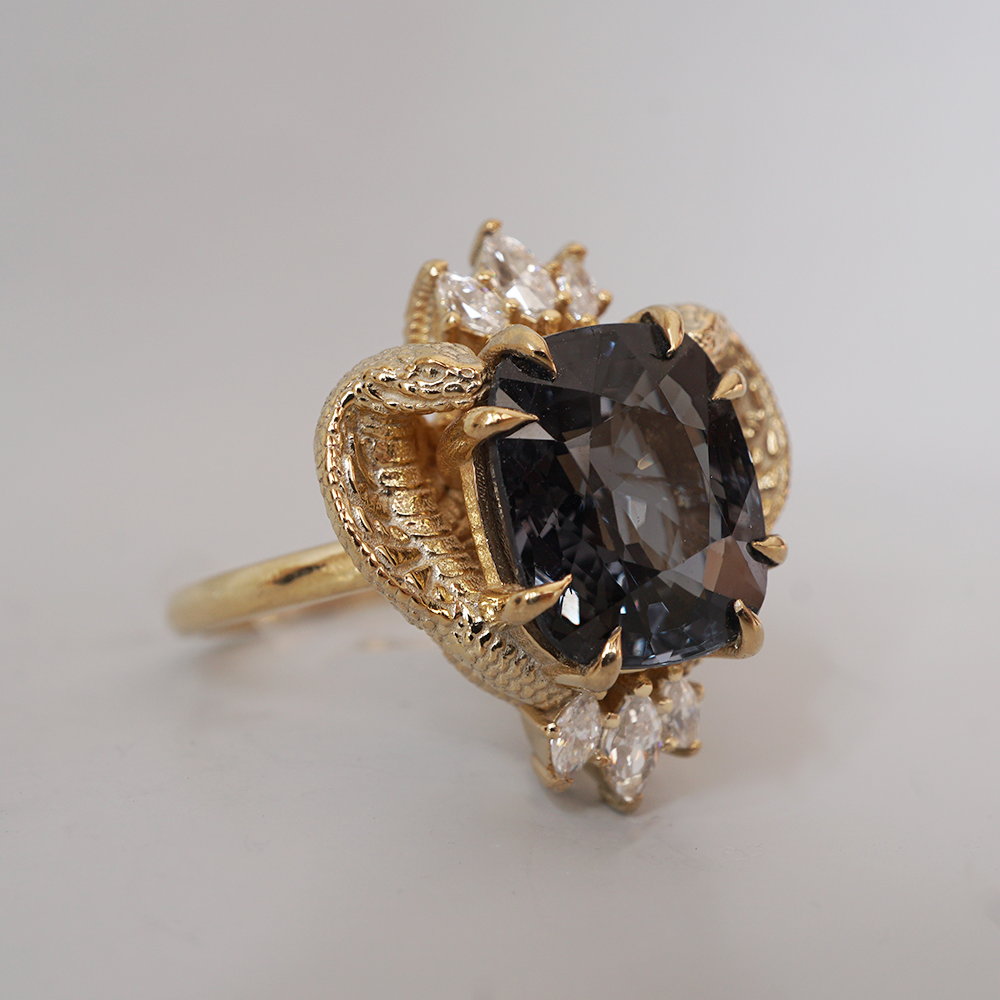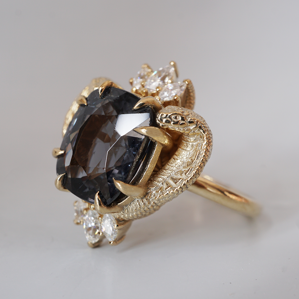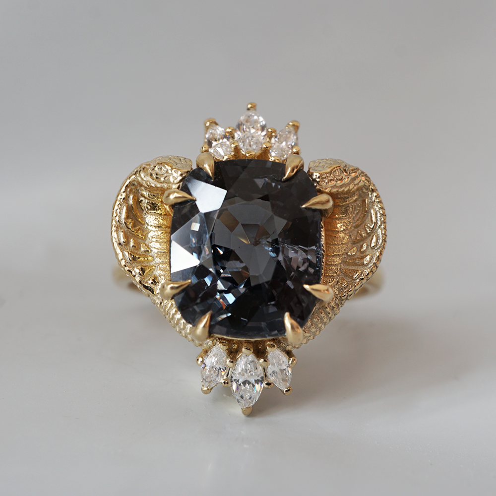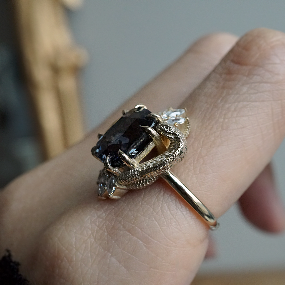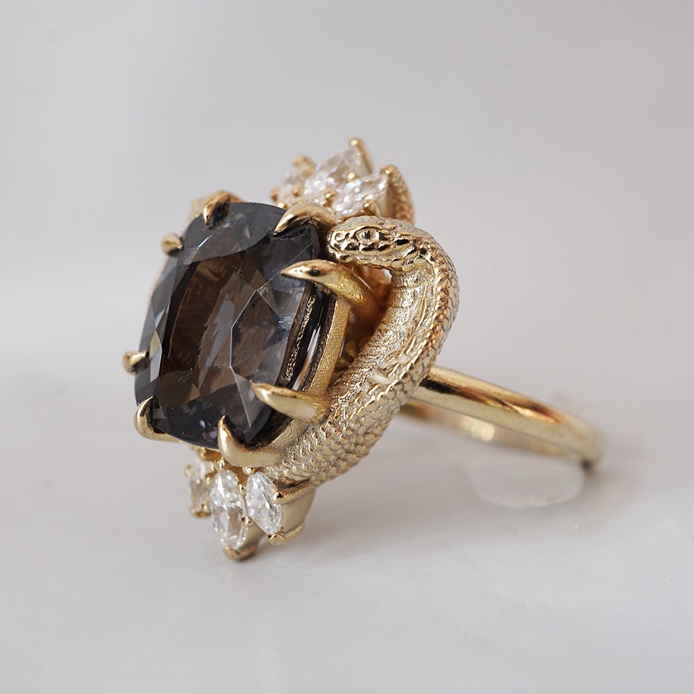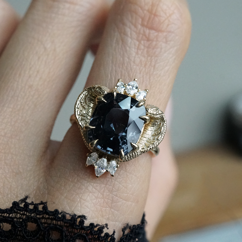 One Of A Kind: Metallic Black Spinel Cobra Diamond Ring in 14K and 18K Gold
