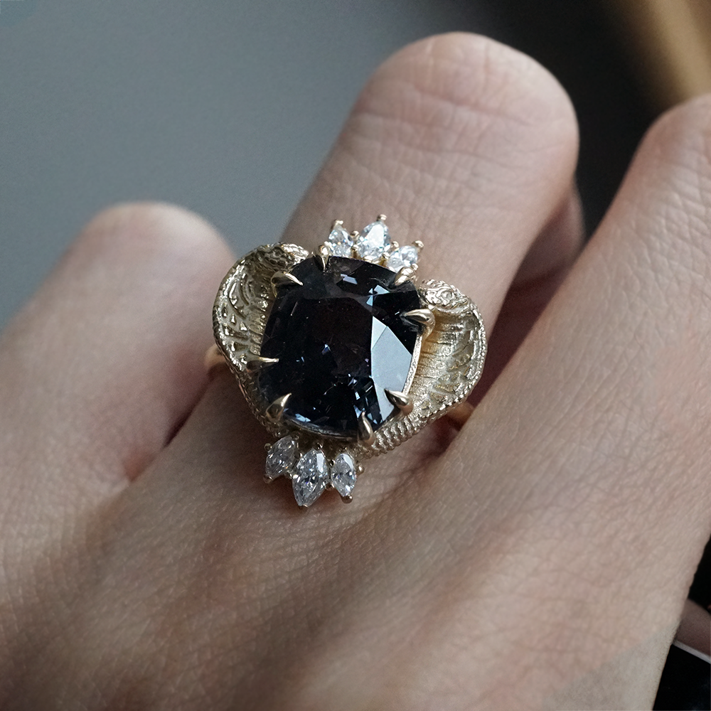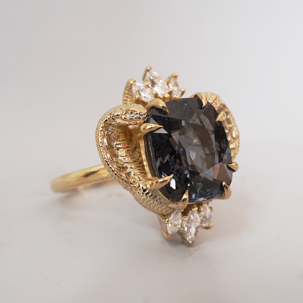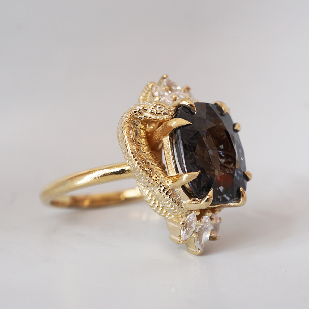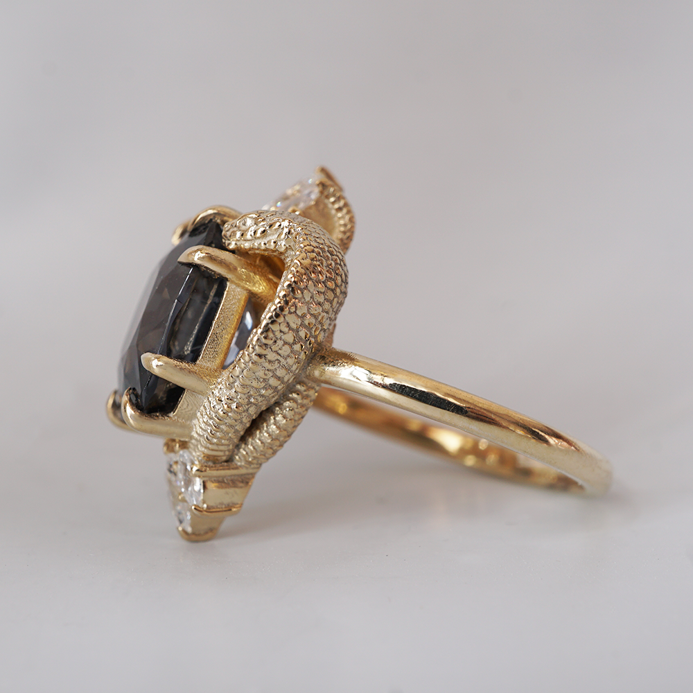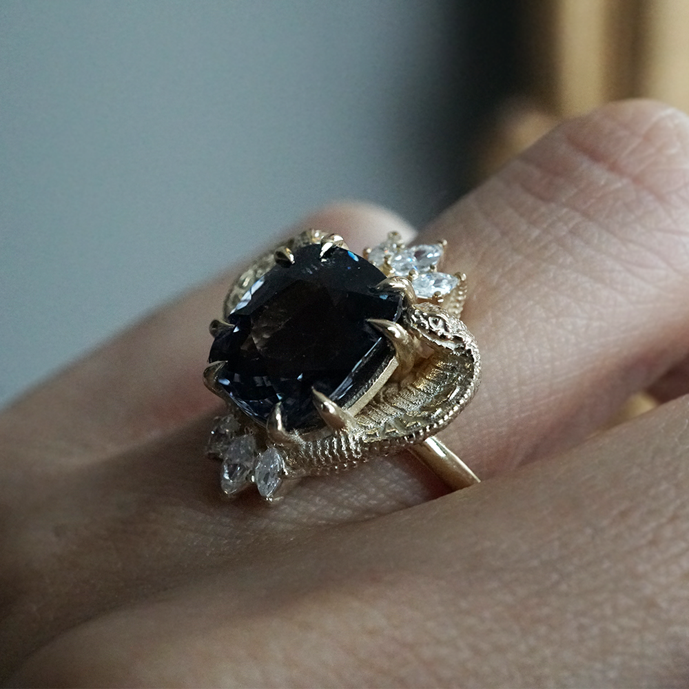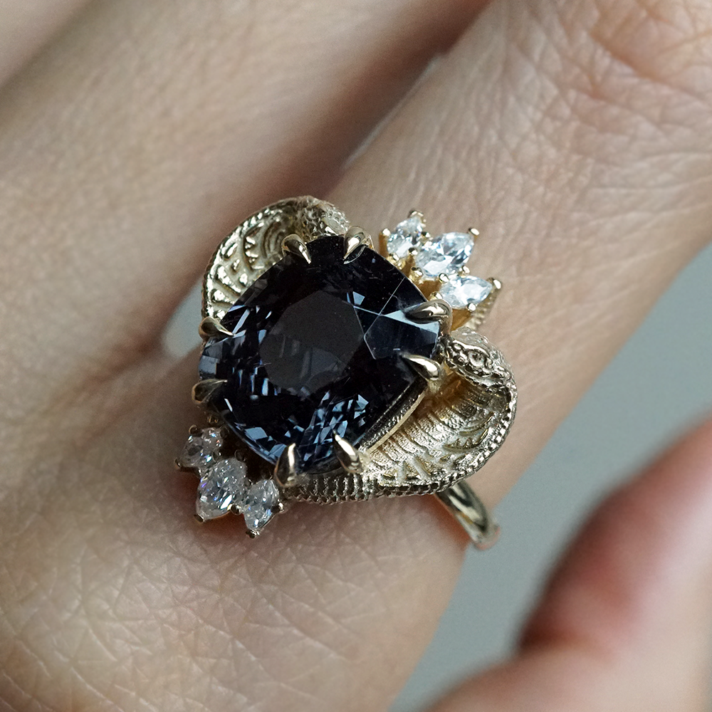 One Of A Kind: Metallic Black Spinel Cobra Diamond Ring in 14K and 18K Gold