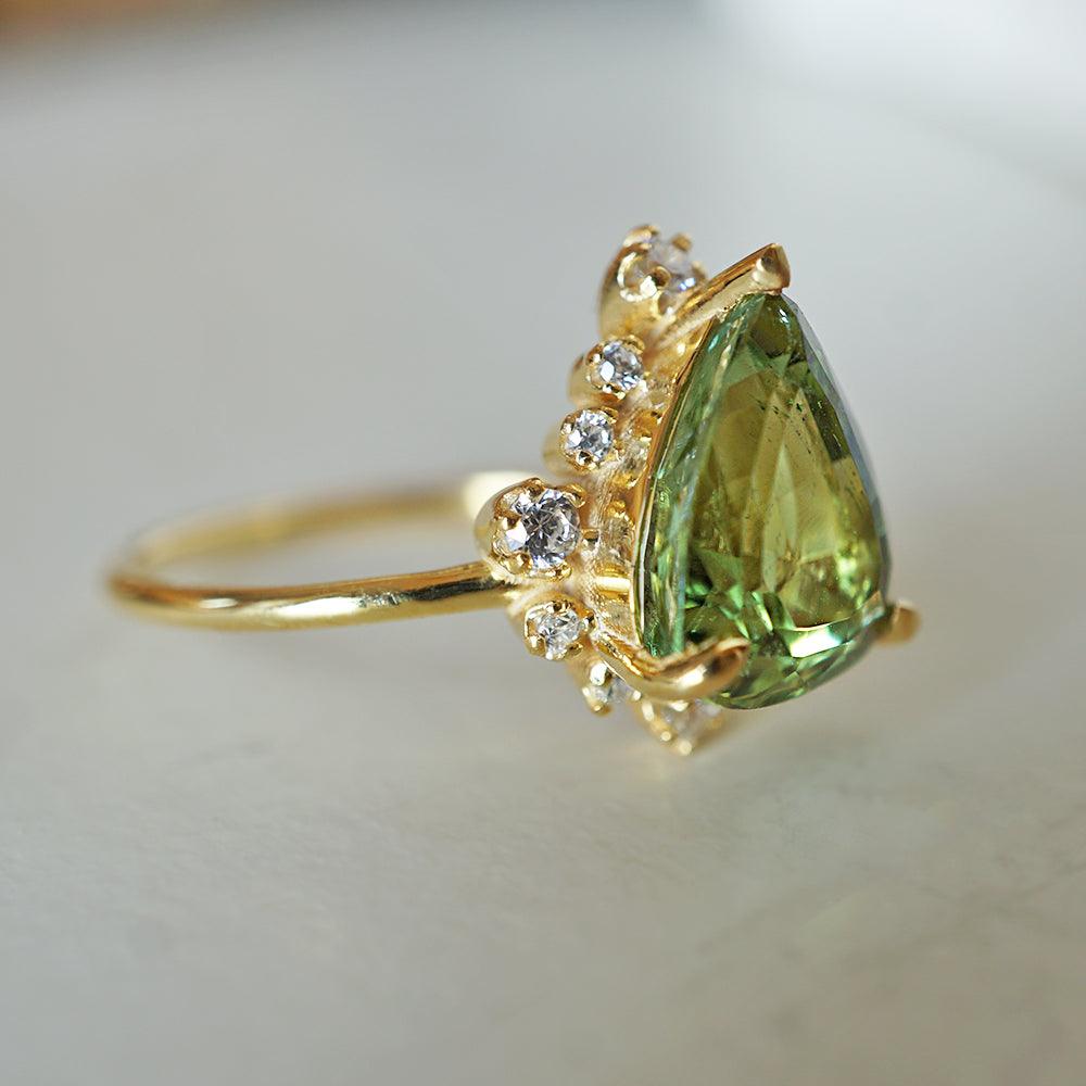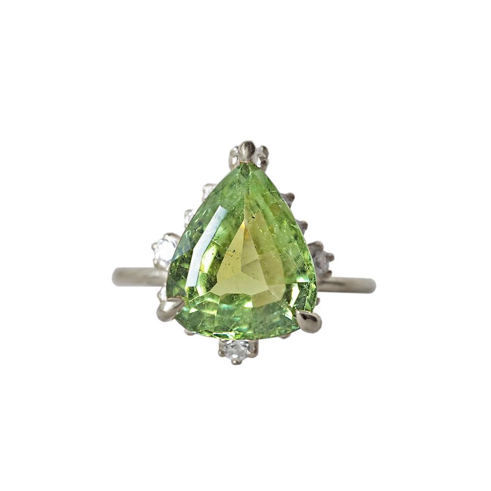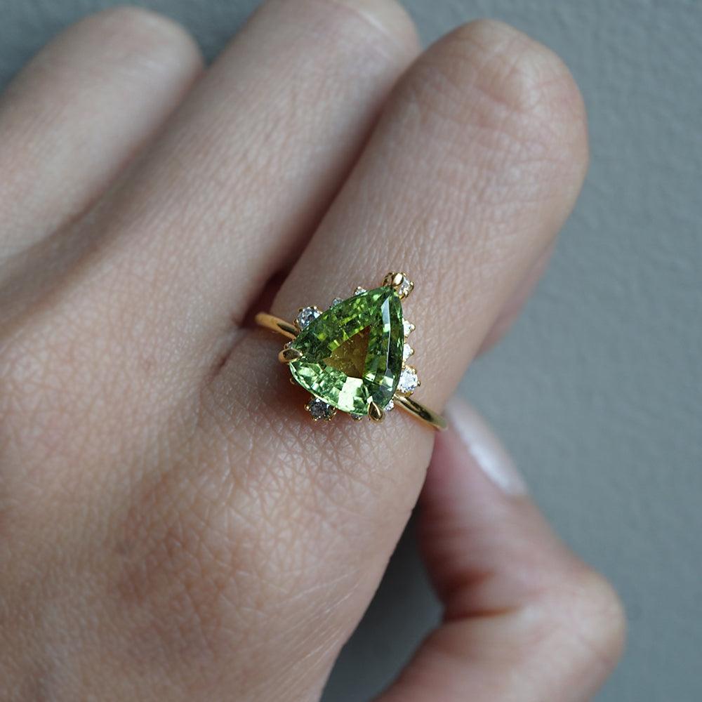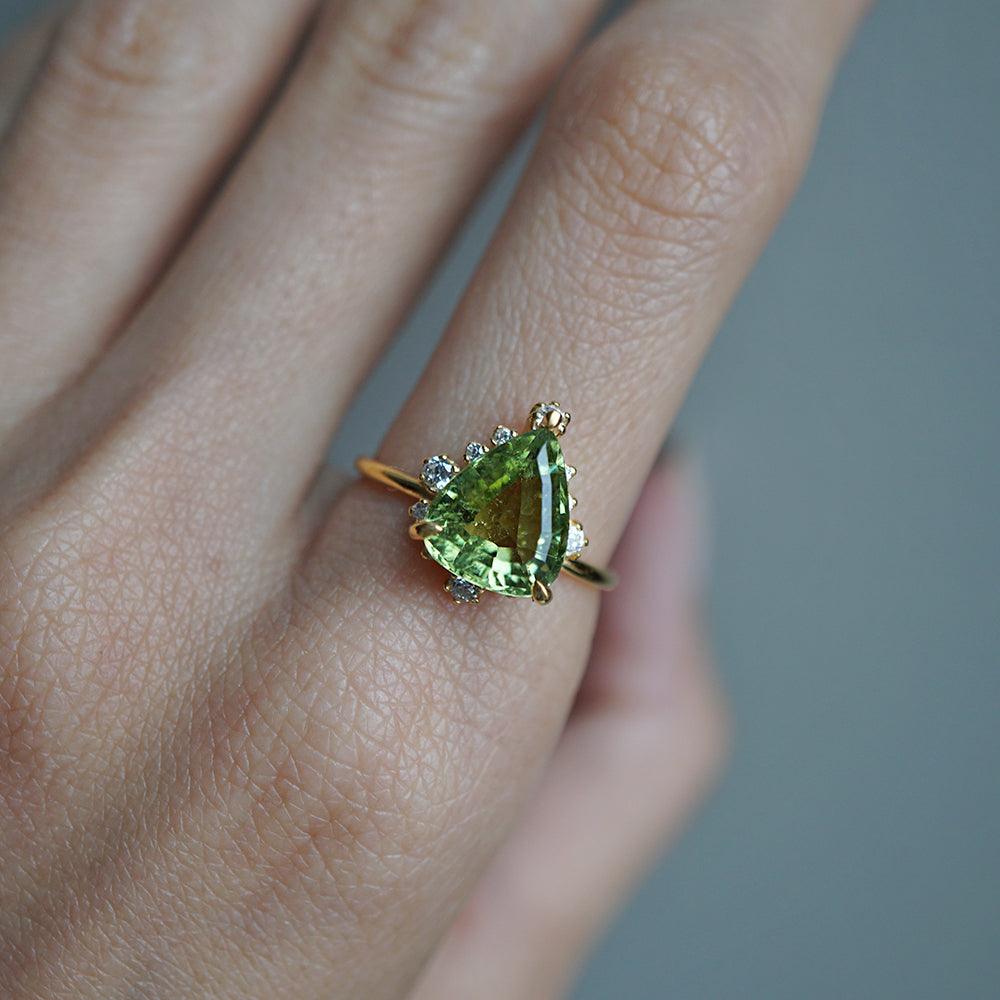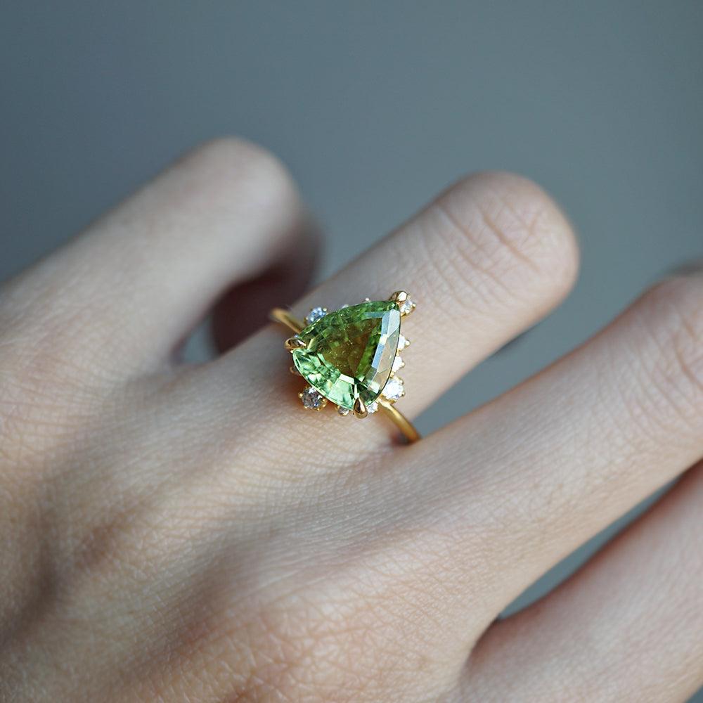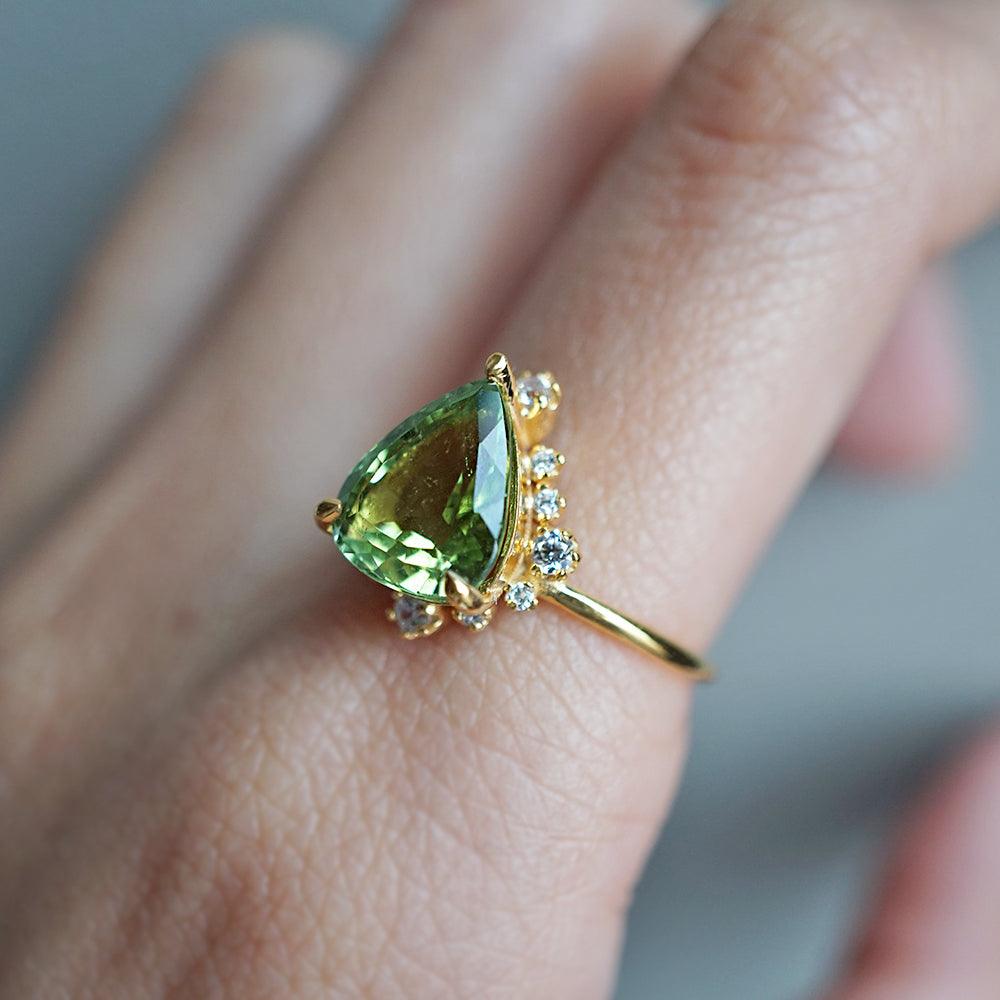 One Of A Kind: Trillion Green Tourmaline Gardenia Diamond Ring in 14K and 18K Gold