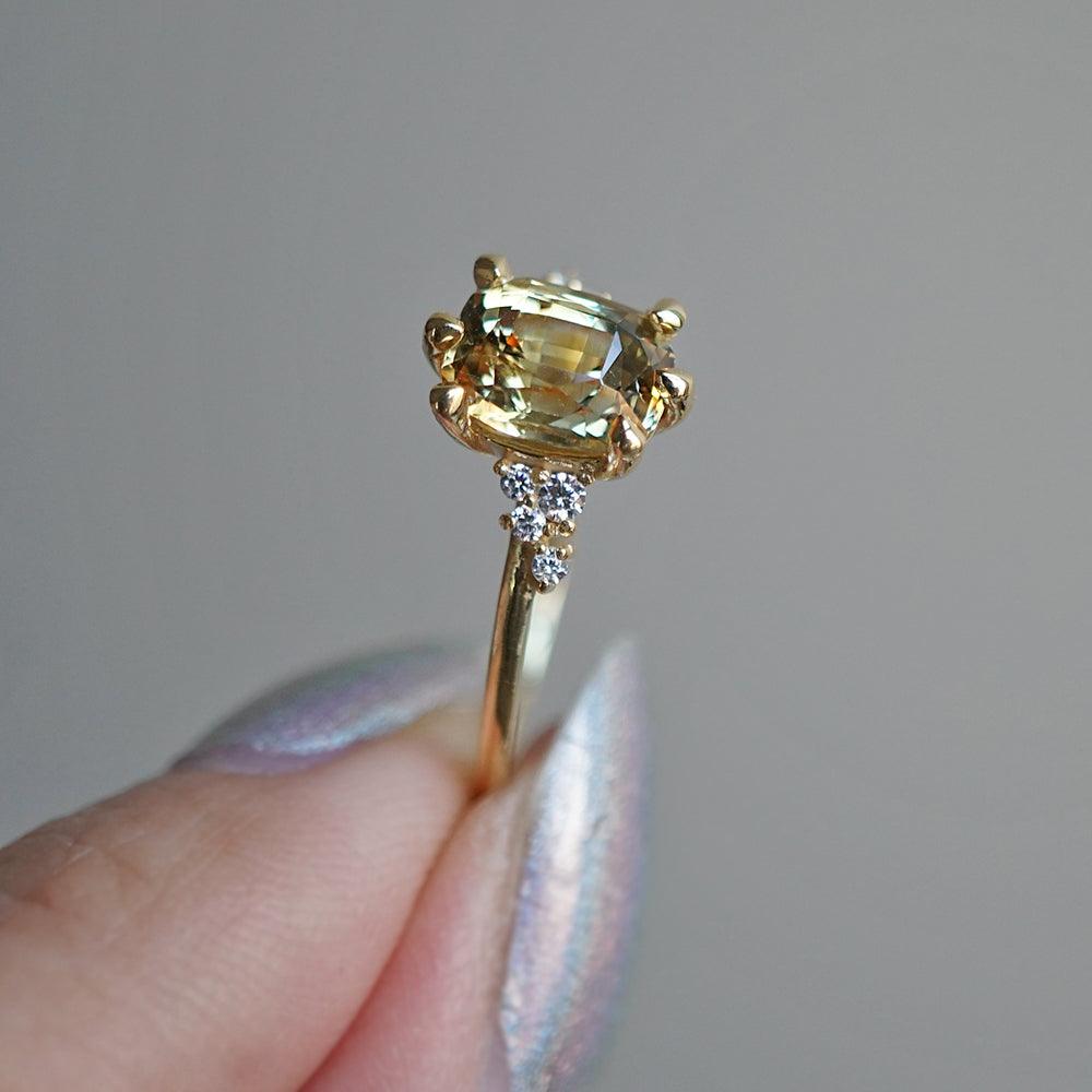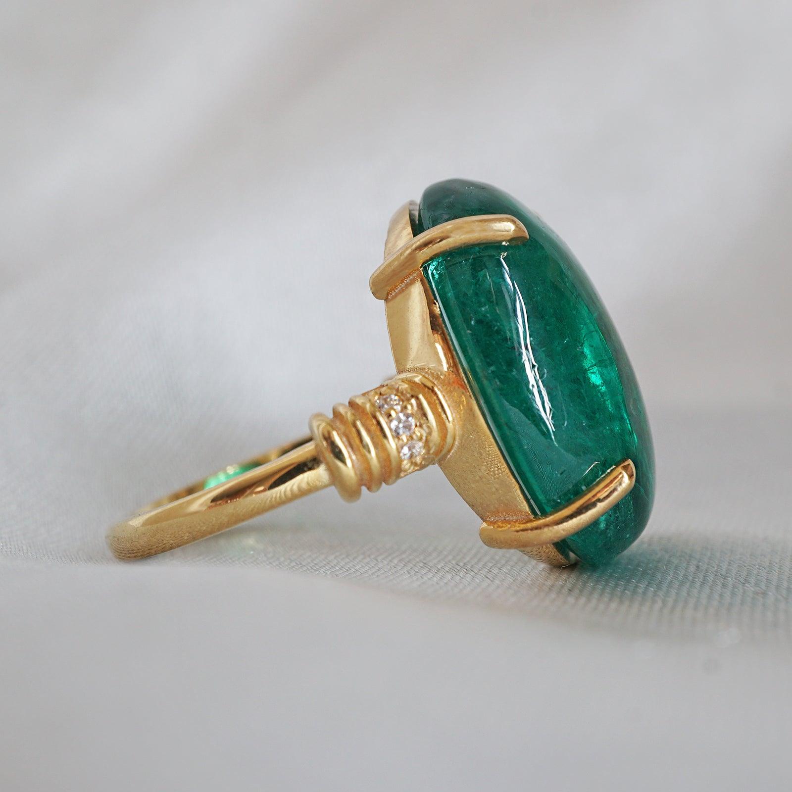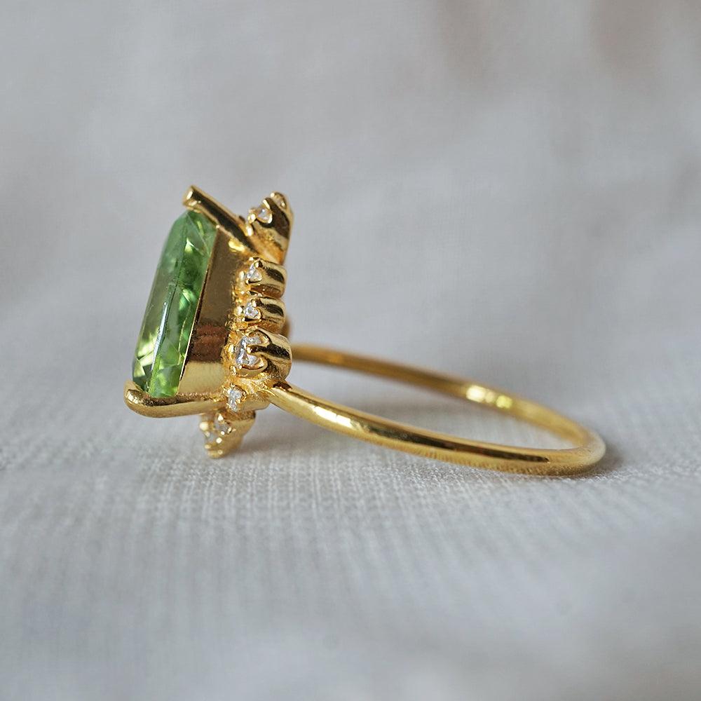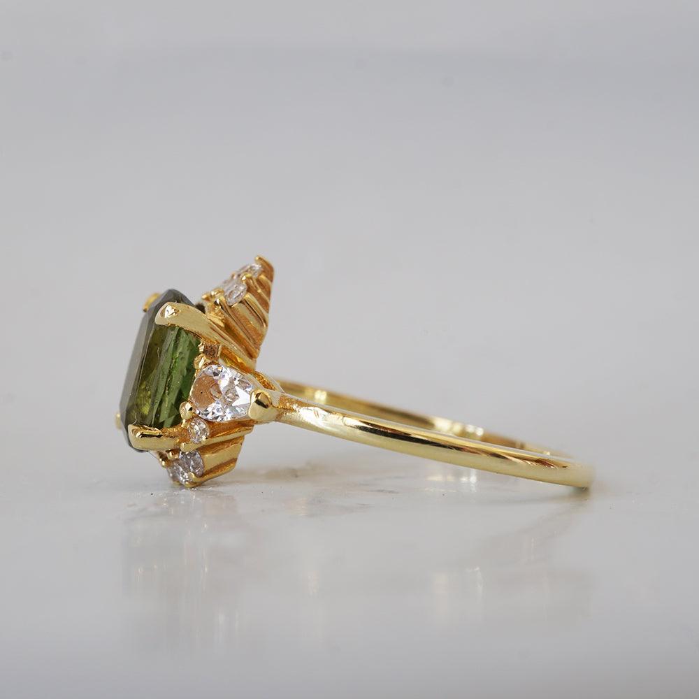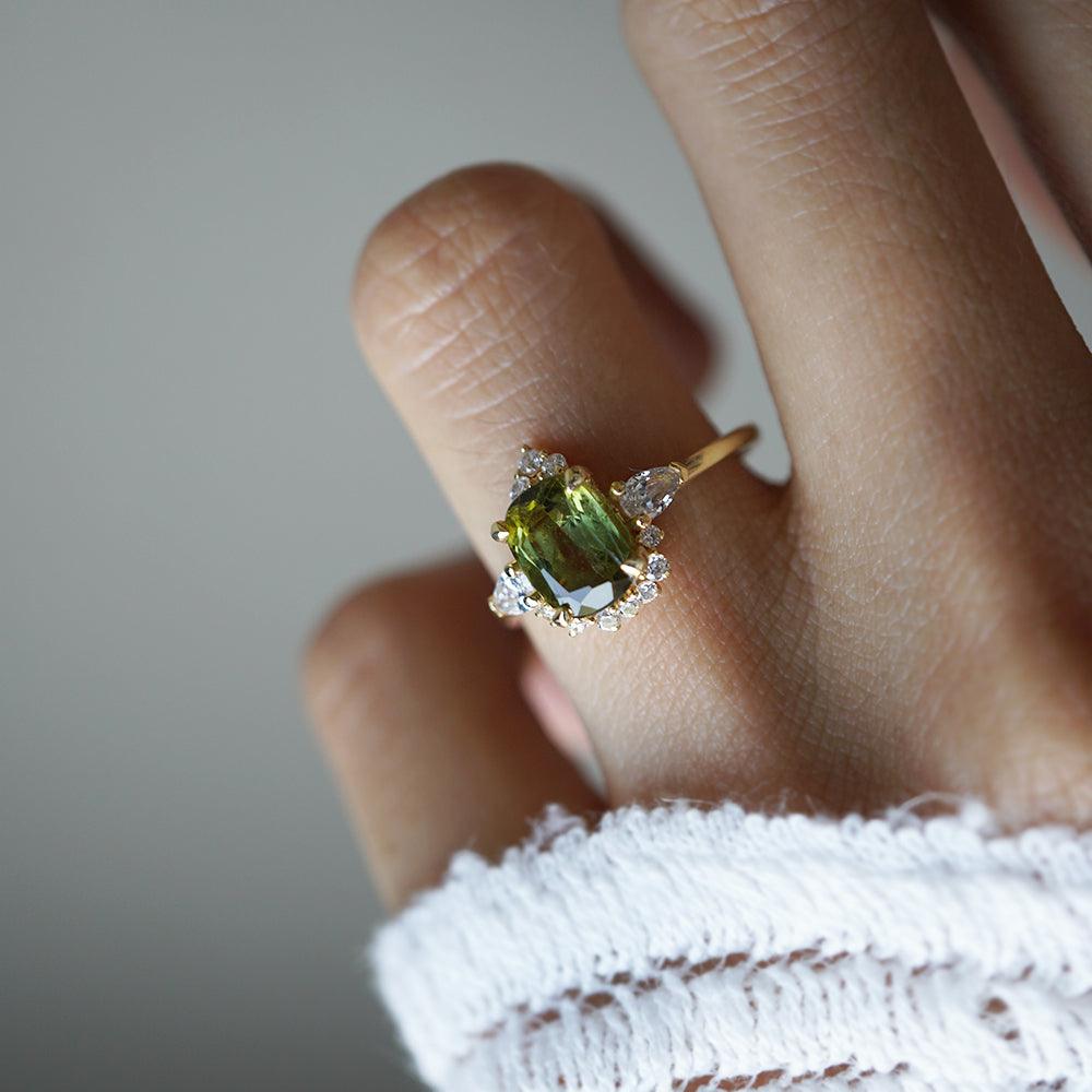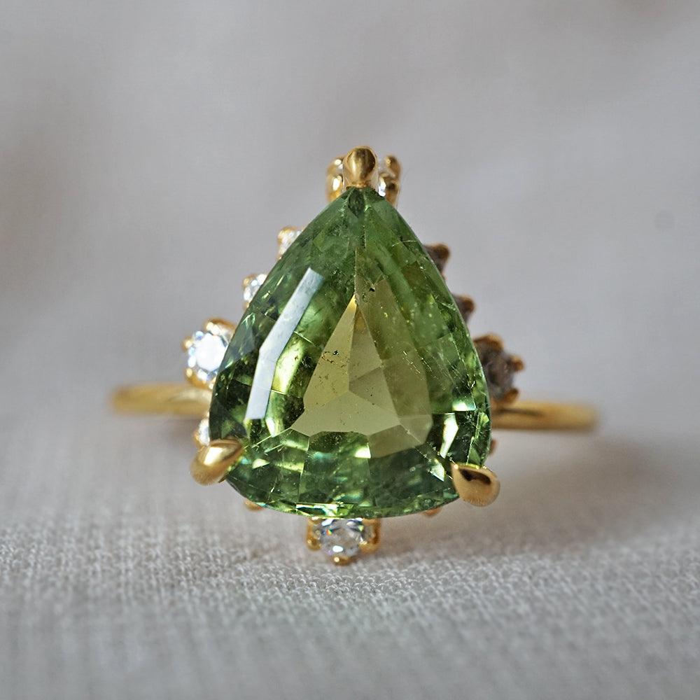 One Of A Kind: Trillion Green Tourmaline Gardenia Diamond Ring in 14K and 18K Gold