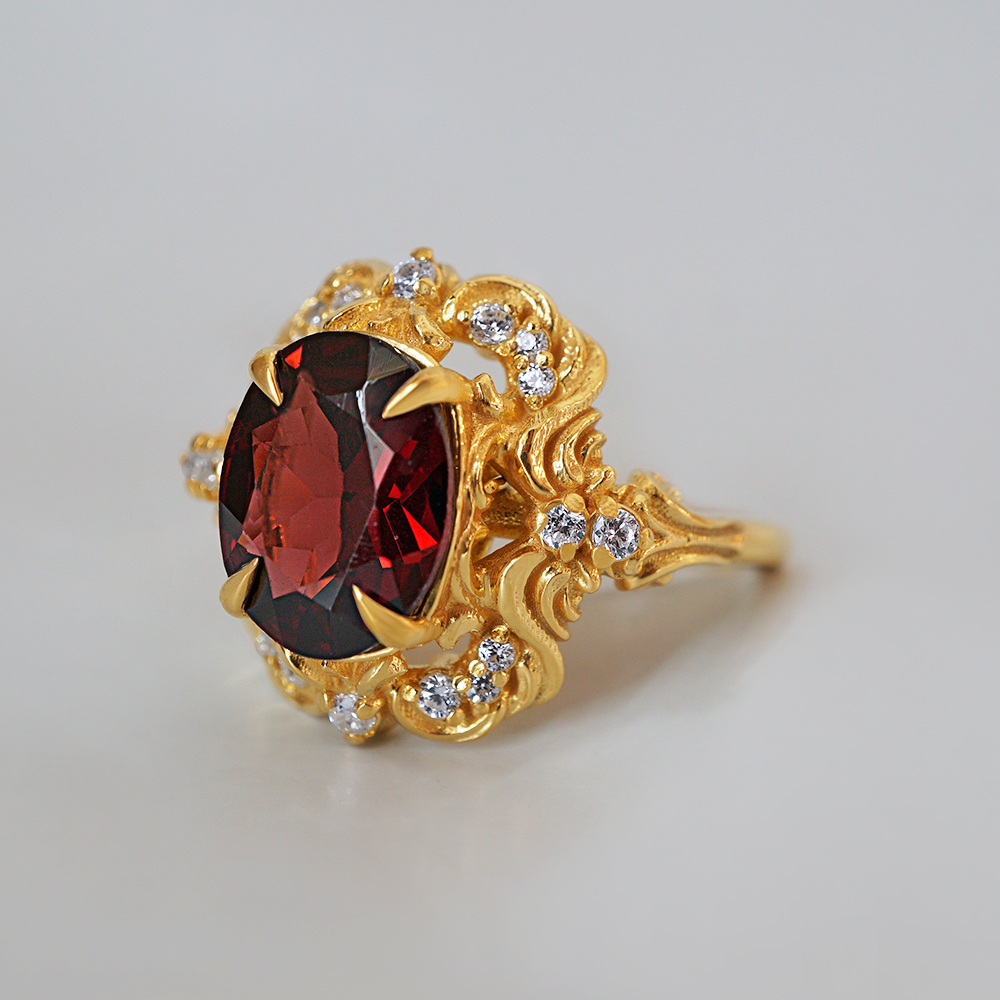 Rich, romantic, and resplendent — the Sonata Ring is a symphony in gold and garnet. At its heart lies a natural deep red garnet, glowing with the warmth of candlelight and framed by a halo of natural white diamonds. Every curve and flourish of the baroque-inspired setting echoes the rhythm of a timeless melody — intricate, balanced, and exquisitely composed.