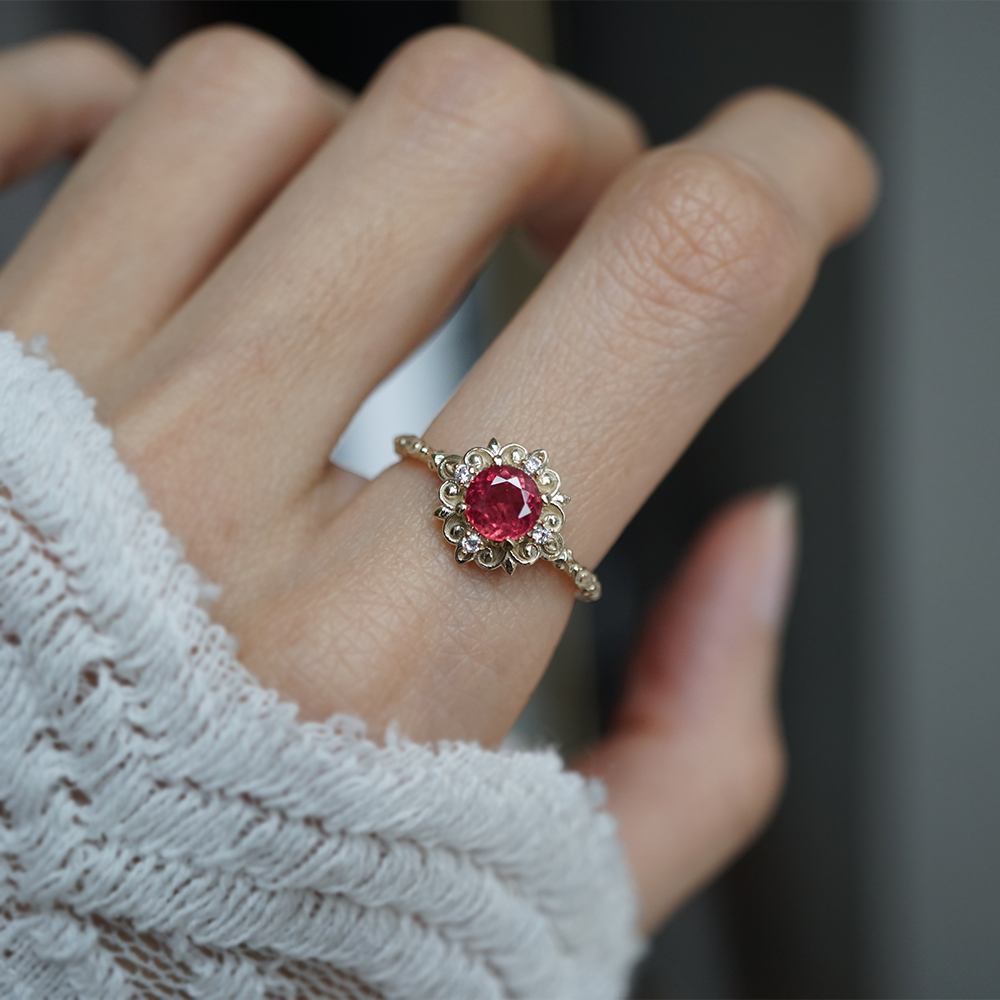 The band features ornate vintage-inspired details, each curve and swirl carved with intention, echoing old-world craftsmanship. Fiorella is for the dreamer, the romantic, the one who finds poetry in petals and strength in fire. A love letter to nature and elegance—Fiorella is not just a ring, but a story waiting to be told.
